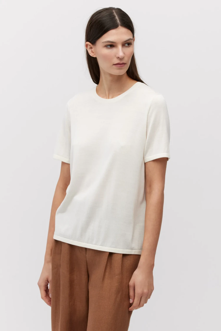 Nasza bluzka z kaszmirem ma prosty krój i klasyczne detale, takie jak rękawy typu wstawianego oraz standardową, praktyczną długość, dzięki czemu idealnie współgra z każdą sylwetką, nie wpływając na jej wizualne proporcje. Dzianina o splocie single jersey, wykonana na maszynie 16 GG, nadaje bluzce subtelną lekkość, a półtransparentna struktura pozwala na zachowanie dyskrecji. Oddychający materiał gwarantuje świeżość nawet podczas upalnych i aktywnych dni.