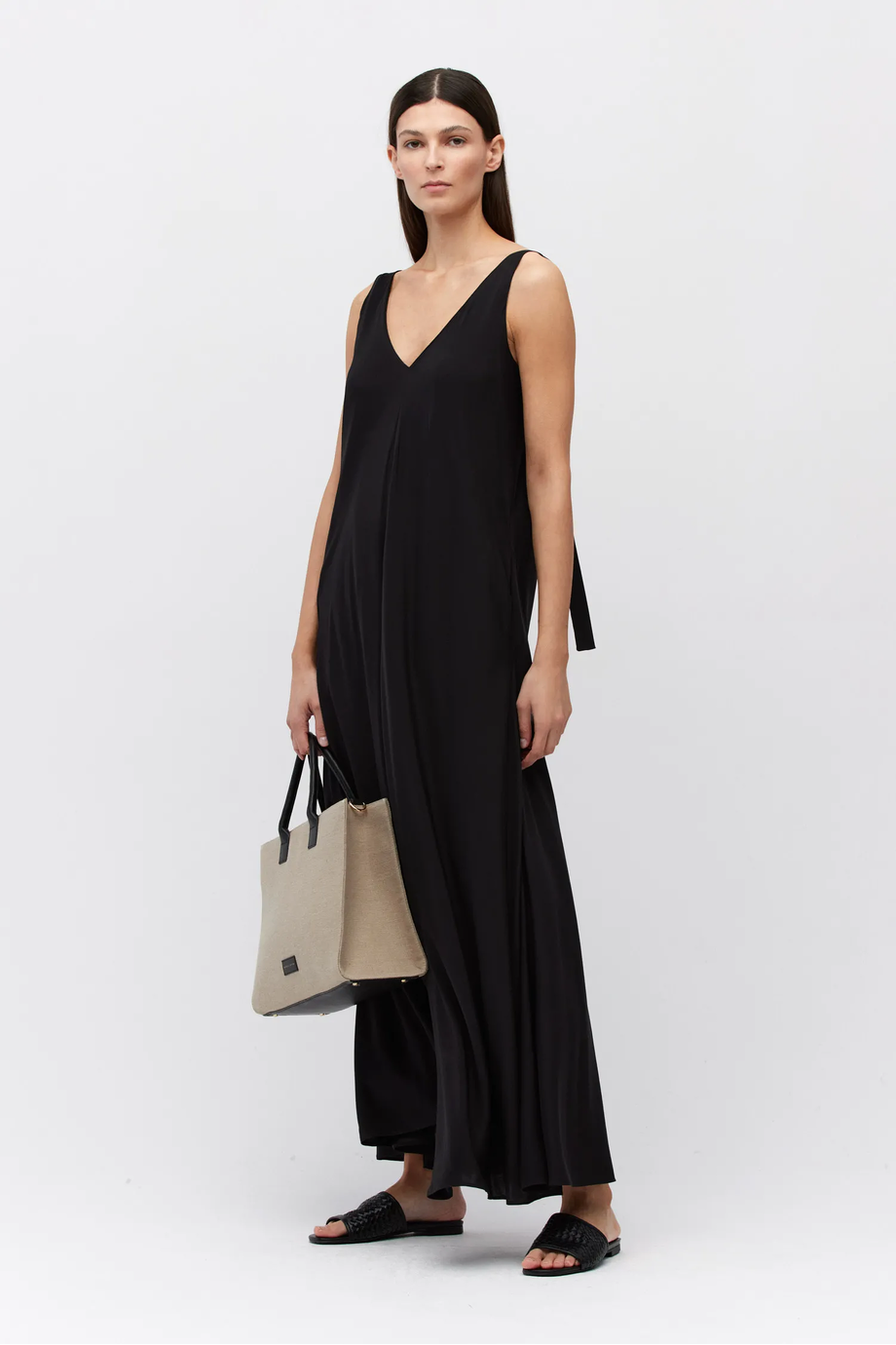 Ta czarna sukienka maxi na lato została uszyta z jedwabiu z dodatkiem elastanu, dlatego jest lekka, chłodna w dotyku, komfortowa i świetnie układa się w ruchu. Ma trapezowy fason, czyli lekko dopasowany w górnej części i rozszerzany ku dołowi. Dekolt w szpic i długość do kostek pracują na korzyść optycznego wysmuklenia figury. Szerokie ramiączka są regulowane za pomocą dużych klamer z tyłu. Paski z nadmiarem materiału, które mają swobodnie opadać na plecy, tworzą subtelny akcent o biżuteryjnym charakterze, co staje się wyróżnikiem całej konstrukcji.