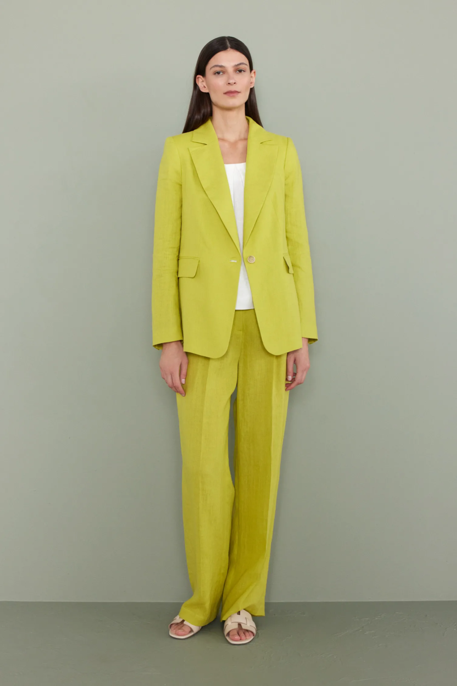 - Szerokie spodnie z lnu w kolorze limonkowym, z zakładkami
