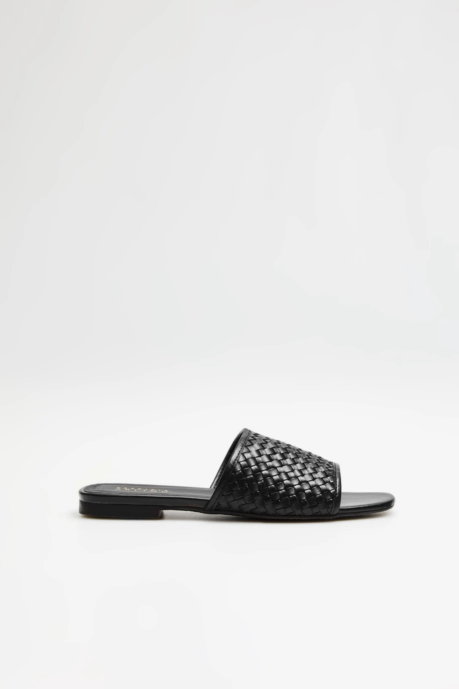- Czarne klapki na płaskiej podeszwie z szerokim paskiem z plecionej skóry