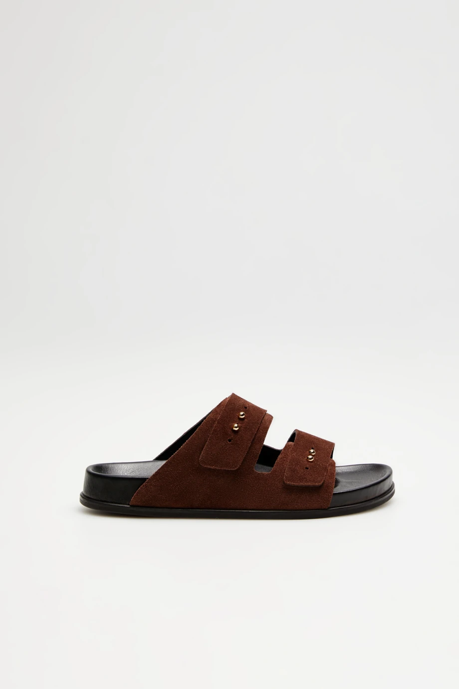 - Klapki z naturalnej brązowej skóry zamszowej, z dwoma szerokimi paskami, ręcznie wykonane w polskiej manufakturze