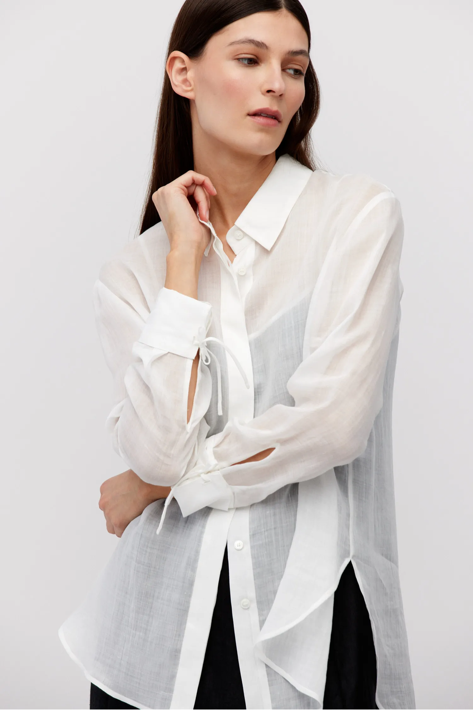 Zaprojektowana z myślą o lecie, ale nie tylko o wakacjach, nasza biała koszula z długim rękawem ma luźny krój, rękawy delikatnie opadające z ramion i wykończone wiązaniem przy mankietach. Ramię jest lekko obniżone, zgodnie z trendem akcentowania linii barków, choć tu na sposób łagodny i kobiecy.