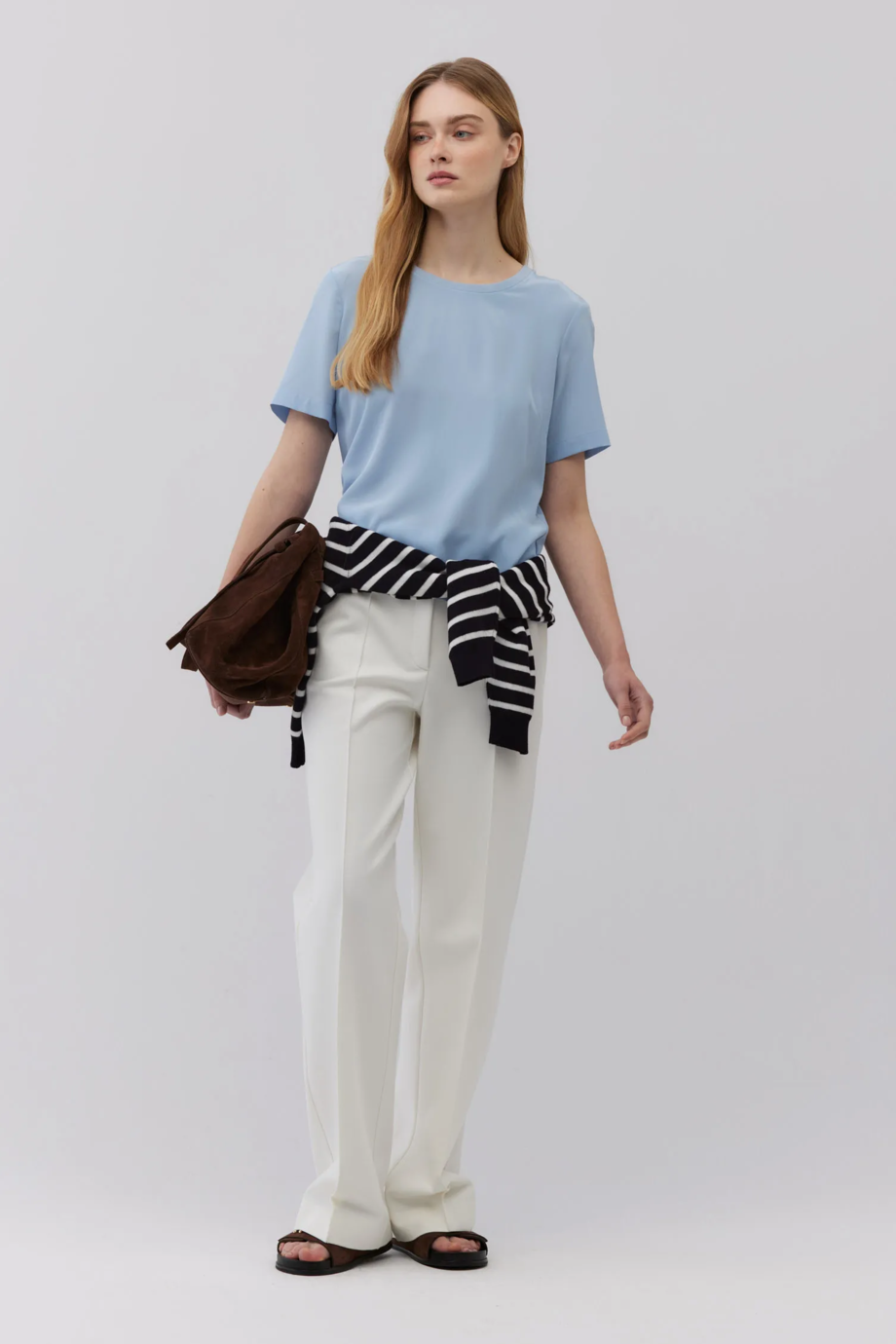 Błękit, chłodny i rozświetlający, świetnie odnajduje się zarówno w towarzystwie pasteli, np. hitowej barwy panna cotta, jak i bazowych śmietany czy szarości, tworząc sensualne smart casualowe kompozycje. W zestawieniu z granatem buduje nowoczesne zestawienie w modnym klimacie marynistycznym. Jedwabna bluzka z okrągłym dekoltem Patrizia Aryton może stanowić zarówno warstwę pod garnitur, jak i górę do codziennych jeansów czy koktajlowych spódnic. Model przyjmuje każdy z tych scenariuszy bez wysiłku.