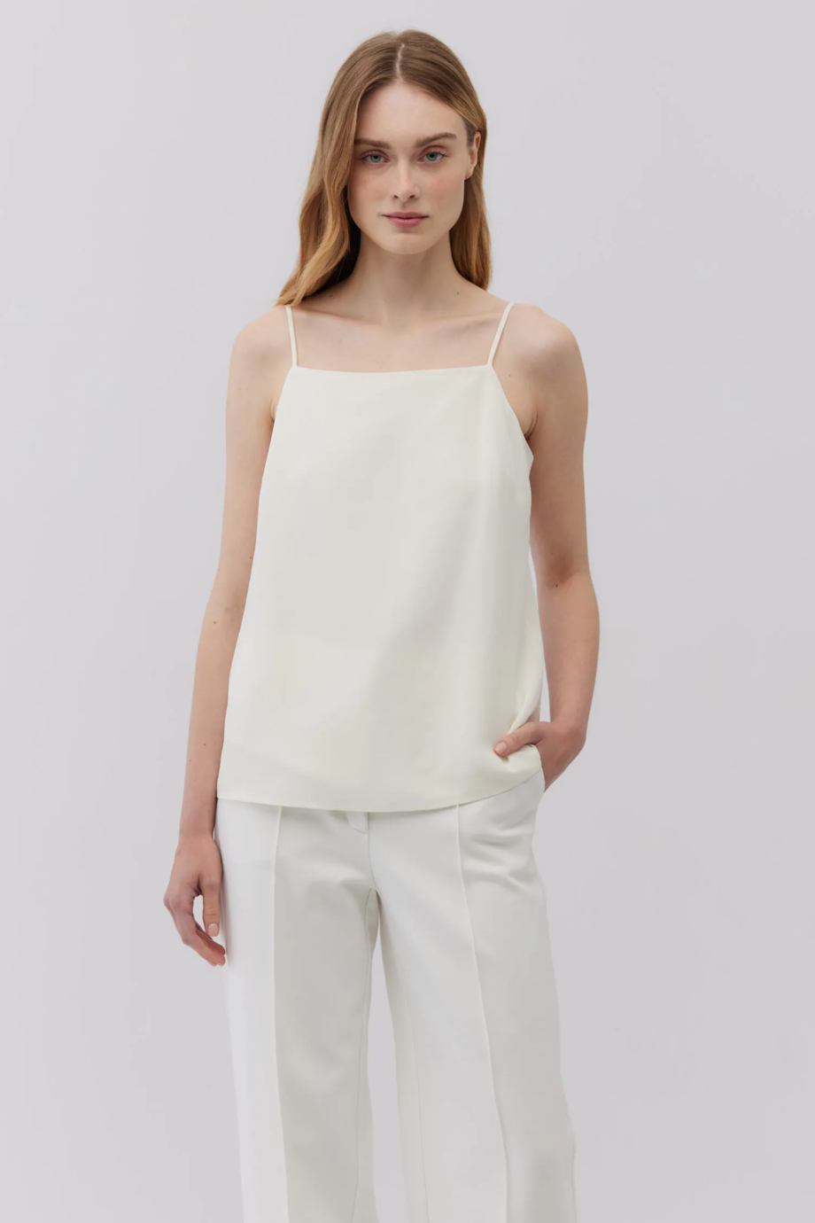 Jedwabny top na ramiączkach. Prosty krój z lekko rozszerzanym dołem. Kwadratowy dekolt. Regulowane, cienkie ramiączka. Wykonany w 100% z jedwabiu.