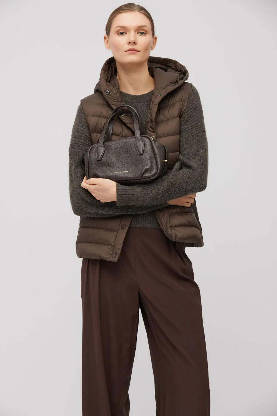 Kamizelka puchowa z kapturem. Zapinana na napy. Kieszenie boczne. Kolor brązowy. Idealna na chłodniejsze dni jako warstwa wierzchnia lub docieplenie płaszcza.