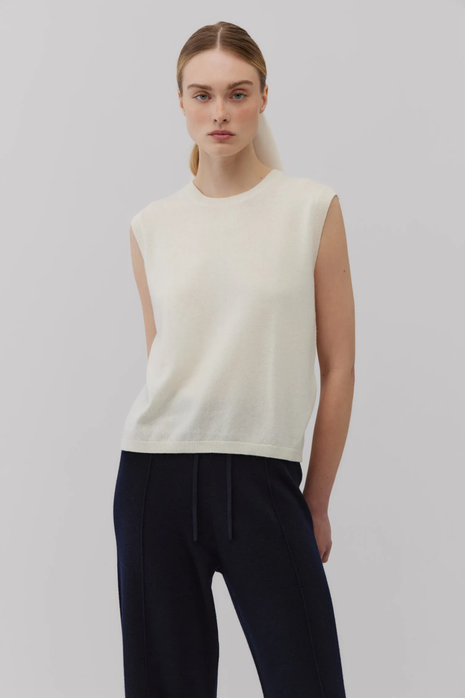 Miękki top bez rękawów z okrągłym dekoltem. Prosty, lekko dopasowany krój. Wykonany z dzianiny z domieszką kaszmiru. Splot single jersey. Kolor biały.