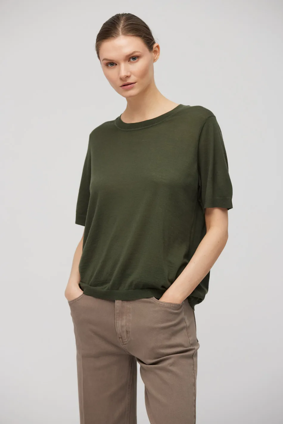 Prosty fason z krótkim rękawem i okrągłym dekoltem. Drobny, gęsty splot typu jersey knit, przygotowany na maszynie o uigleniu 18 GG. Kolor zielony. Model dostępny w dwóch kolorach.