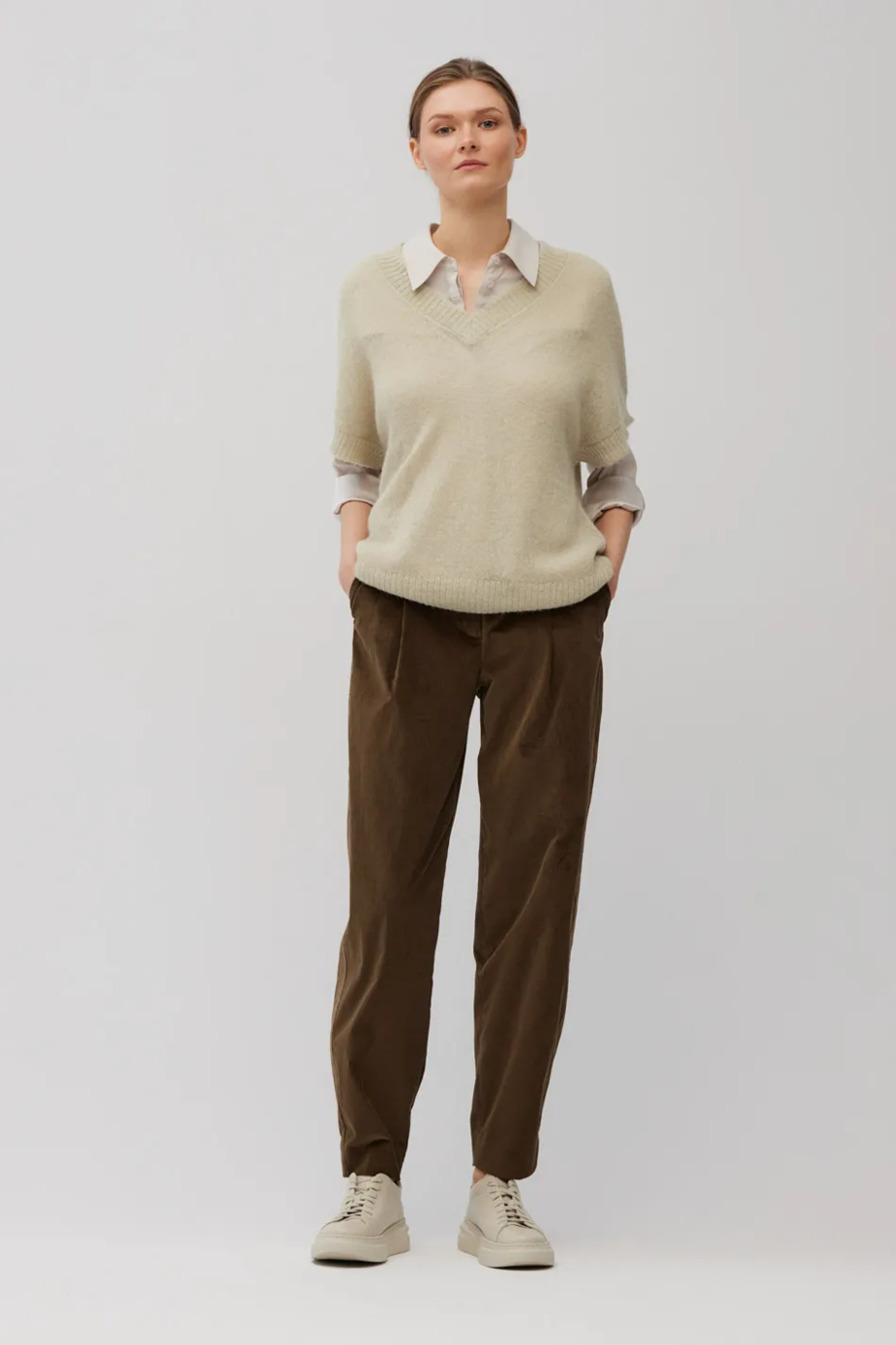Sweter z krótkim rękawem Patrizia Aryton powstał z mieszanki wełny z alpaki i wełny merynosowej z dodatkiem funkcjonalnego syntetyku. Taka kombinacja włókien sprawia, że dzianina jest wyjątkowo miękka i przyjemna w dotyku, a jednocześnie sprężysta i trwała, dlatego nie traci kształtu po wielokrotnym noszeniu. Wełna alpaki nadaje aksamitną fakturę i lekkość, wełna merynosowa odpowiada za termoregulację, a poliamid wzmacnia strukturę i zapewnia wytrzymałość.