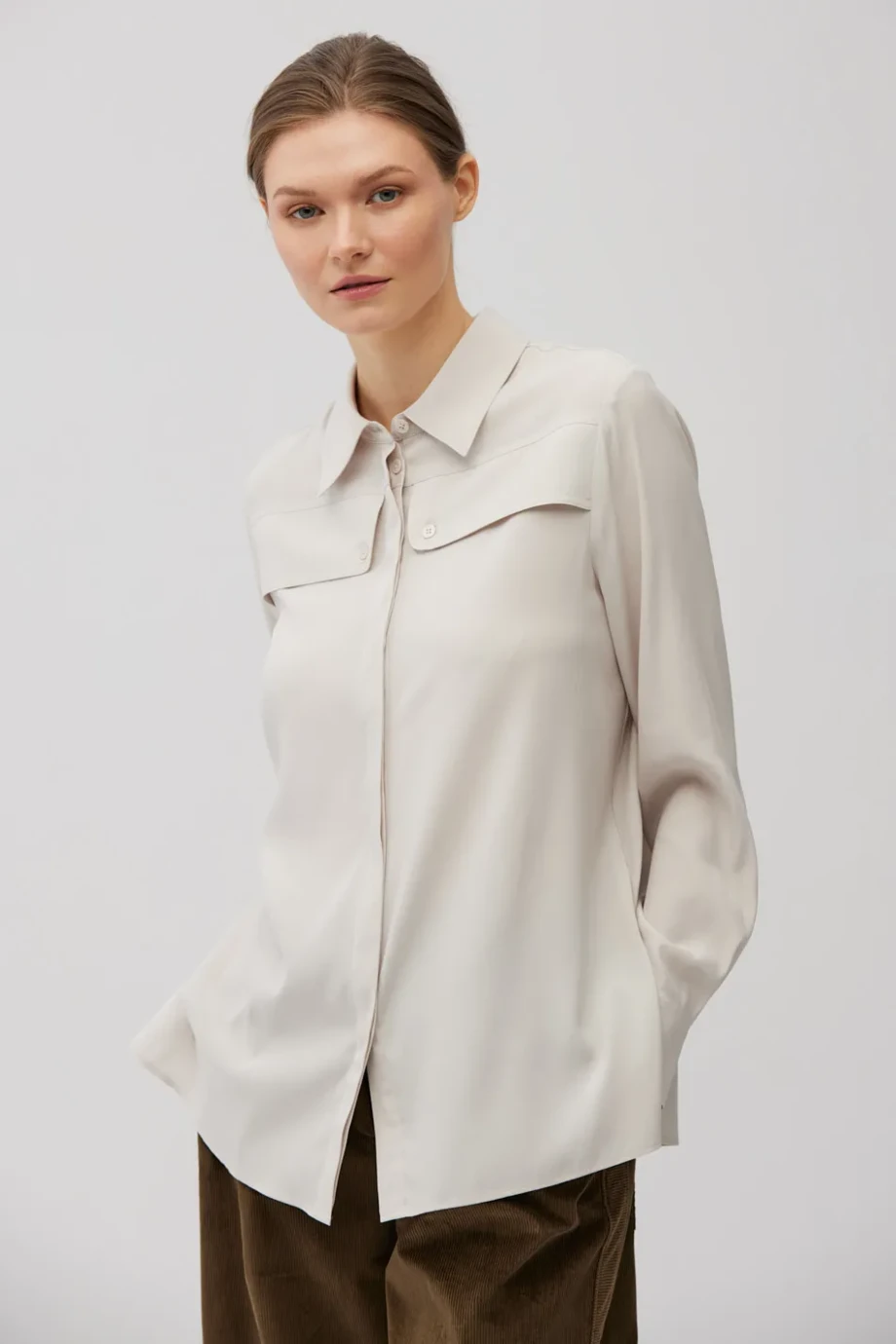 Koszula z jedwabiu. Luźny fason. Klasyczny kołnierz. Długi rękaw z mankietem. Zapinana na guziki. Kolor beżowy.