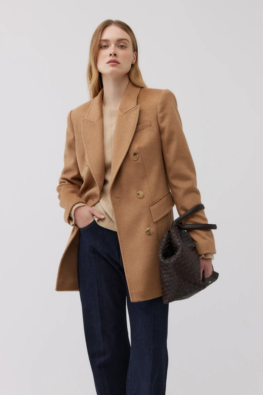 Uszyta z 100% baby camel hair, kurtka wełniana damska zachwyca strukturą i naturalnym ruchem tkaniny. Delikatna wełna wielbłądzia oddycha, grzeje, ma oryginalną fakturę i jest plamoodporna. Camelowa kurtka na guziki Patrizia Aryton występuje w rozmiarach 34–46.