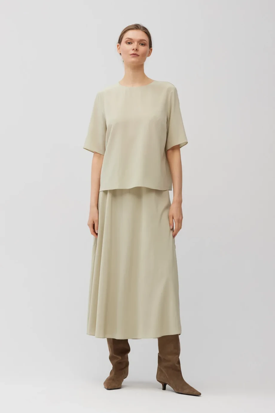 Jedwabna spódnica w odcieniu jasnej zieleni. Zwiewna, o luźnym fasonie z elastyczną talią. Podszewka. Długość midi.