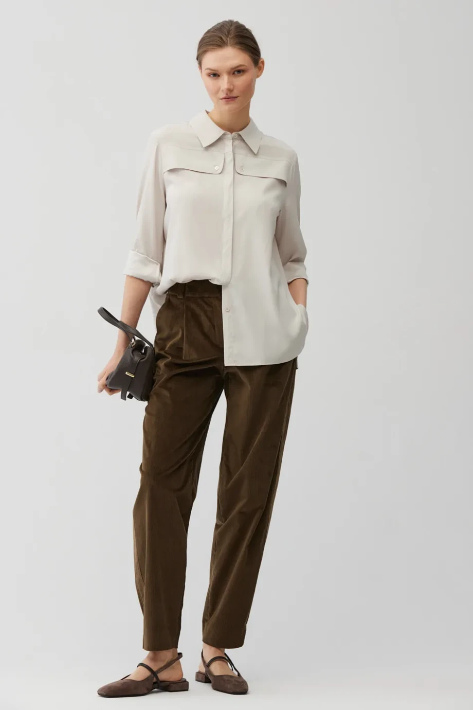 Spodnie z miękkiej tkaniny sztruksowej. Kolor brązowy. Zwężana nogawka, elastyczna talia z tyłu. Boczne kieszenie, wewnętrzne wykończenia ozdobne. Zapięcie na stalowy haczyk i guzik z naturalnego orzecha corozo. Wykonane z bawełny.