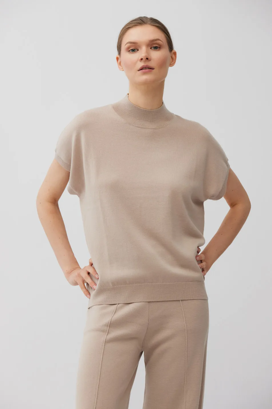 Bluzka wykonana z wełny czesankowej z merynosa, w splocie single jersey, uiglenie 14 GG. Krótki rękaw, okrągły dekolt, luźny fason. Kolor chłodny beż. Do uzupełnienia zestawu spodnie z tej samej dzianiny.