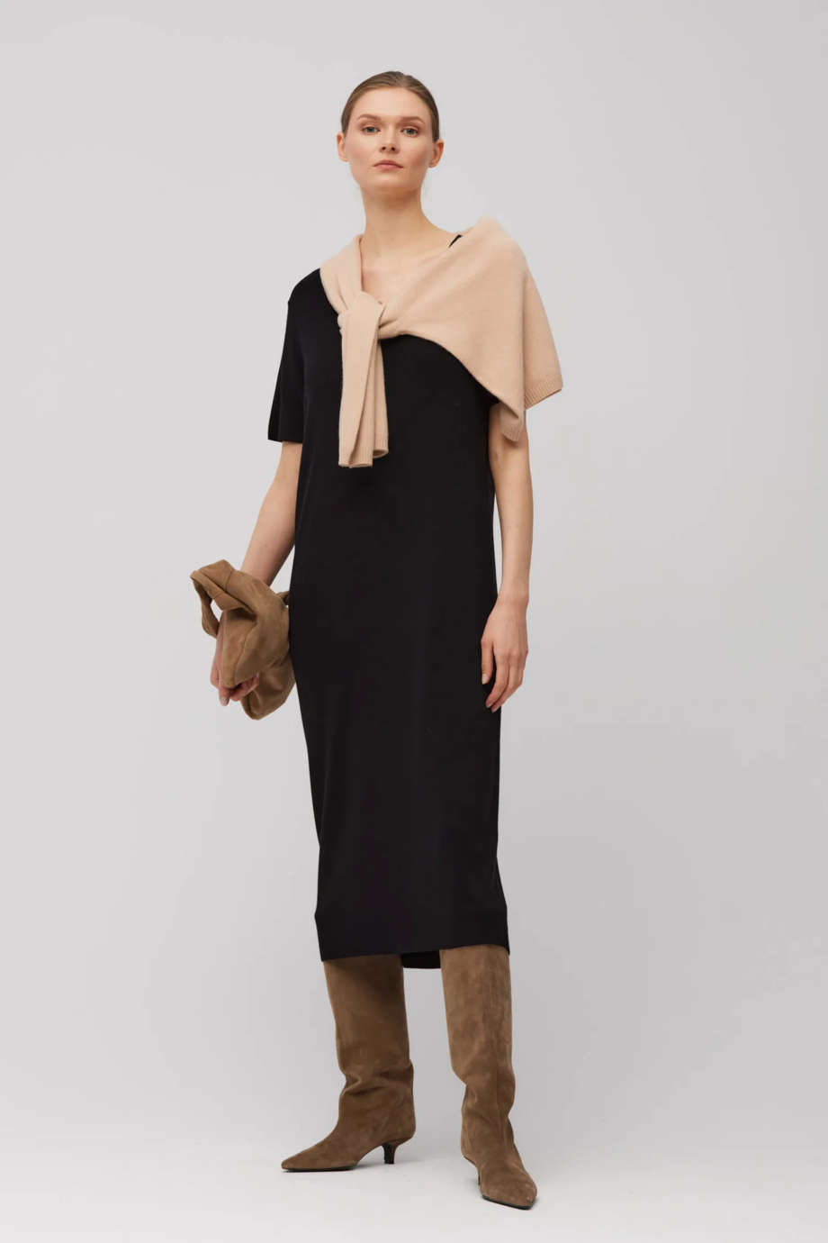 Czarna sukienka midi z dzianiny. Prosty fason z dekoltem w szpic i rękawem do łokcia. Wykonana z wysokiej jakości dzianiny o drobnym splocie FULL NEEDLE na maszynie o uigleniu 12 GG.