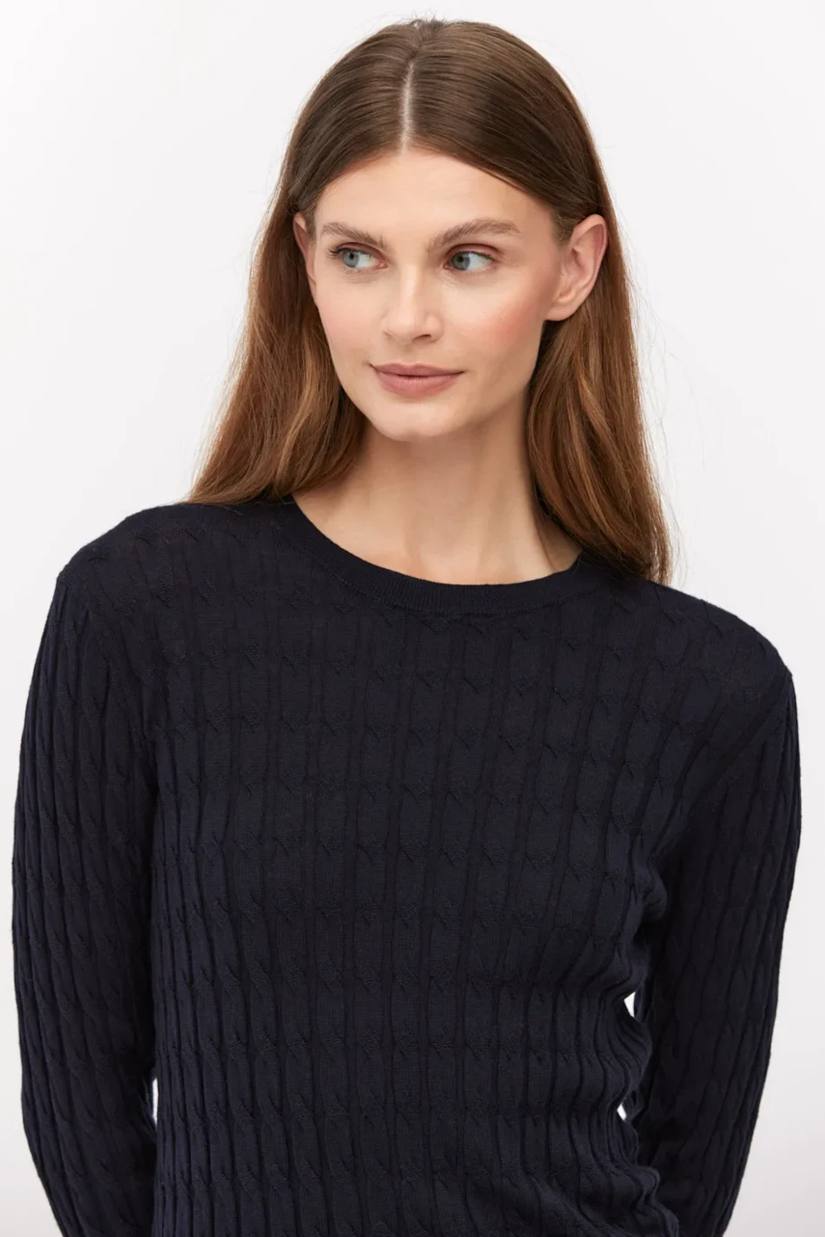 Granatowa bluzka z wełny merynosowej. Dopasowany fason, okrągły dekolt i długi rękaw. Dzianina w ściegu cable knit, wykonana na maszynie o uigleniu 16 GG.