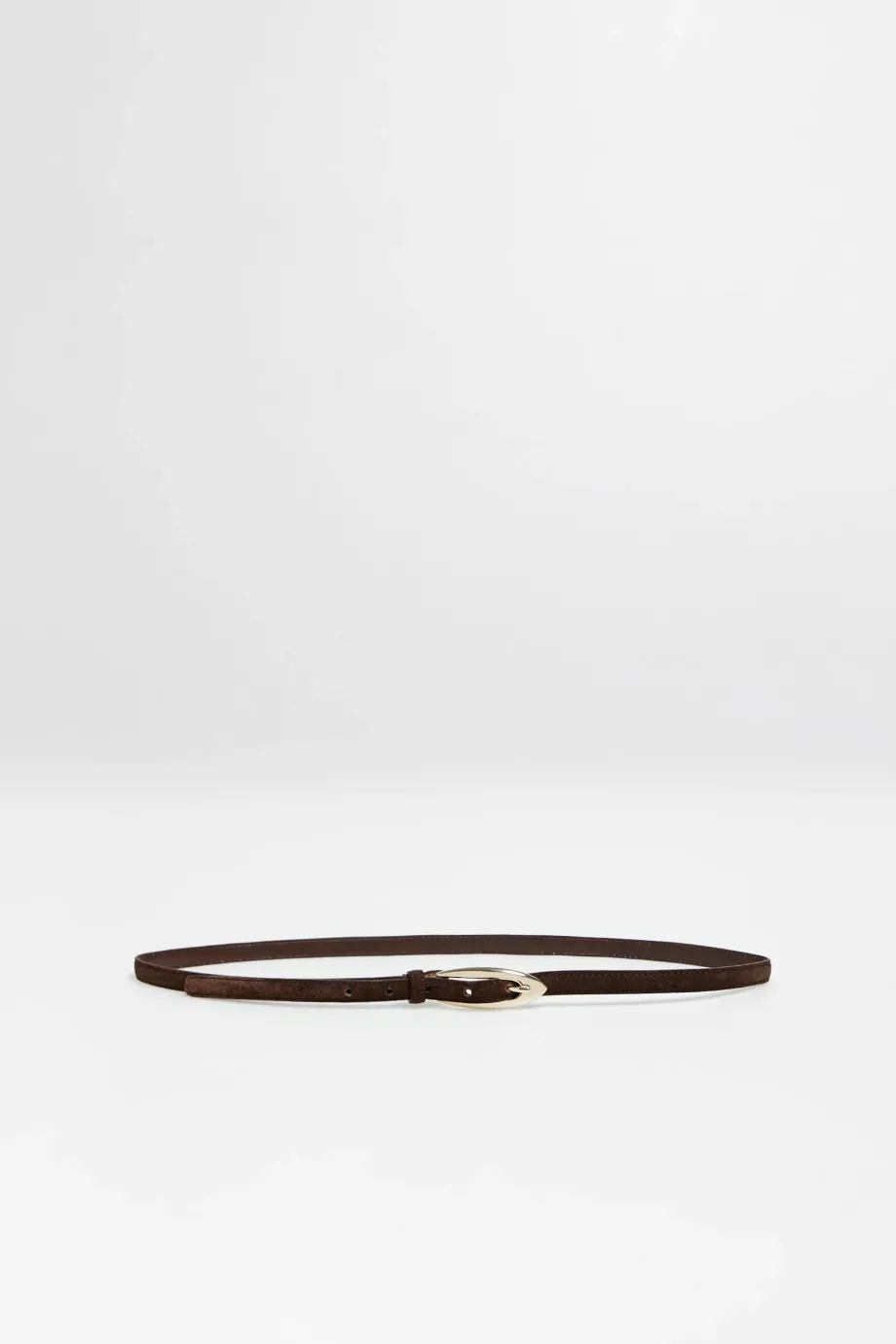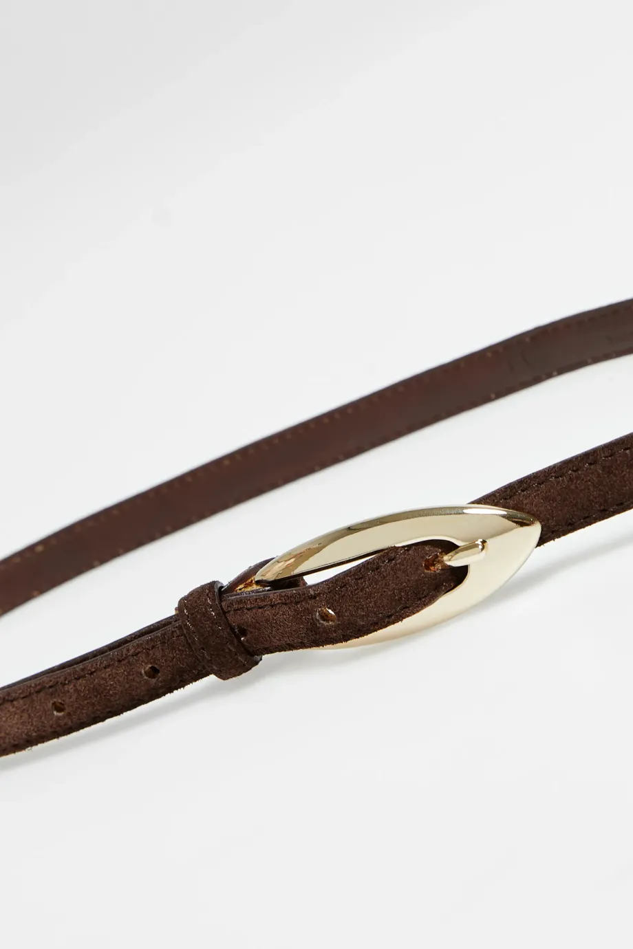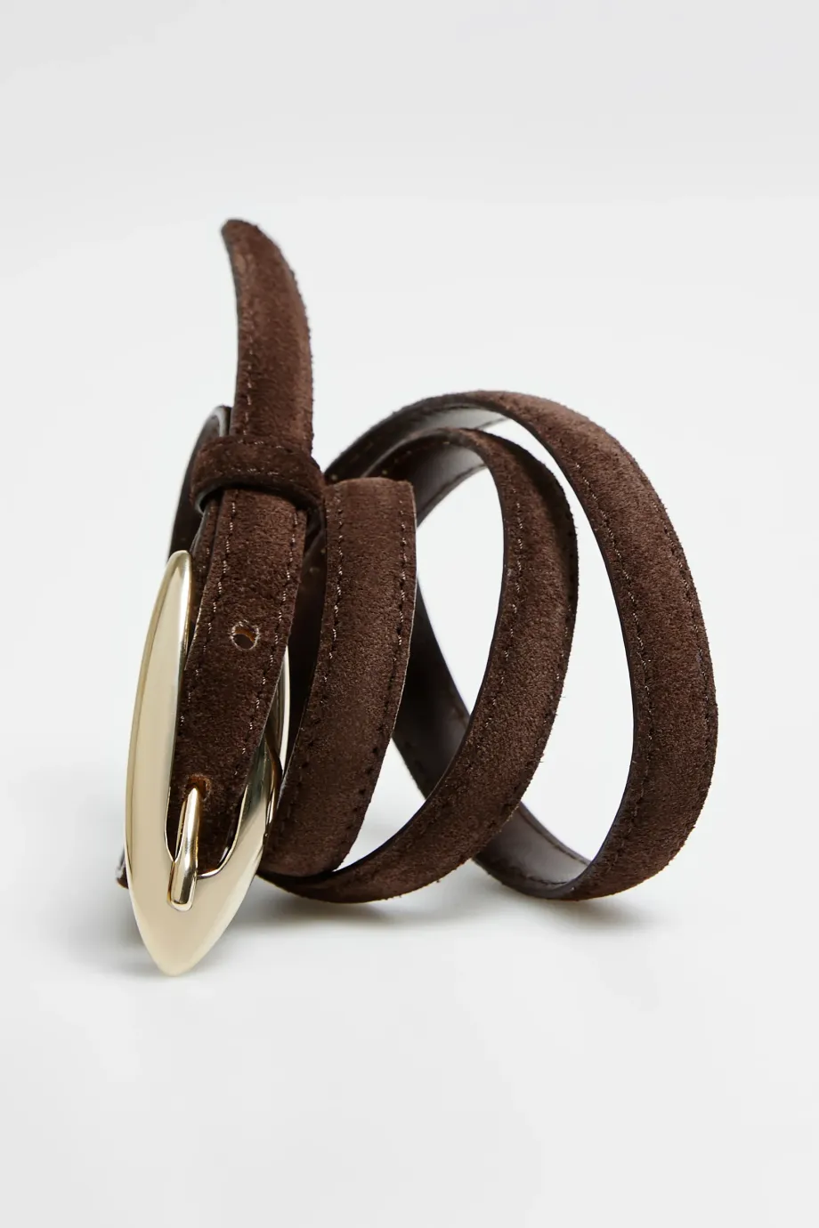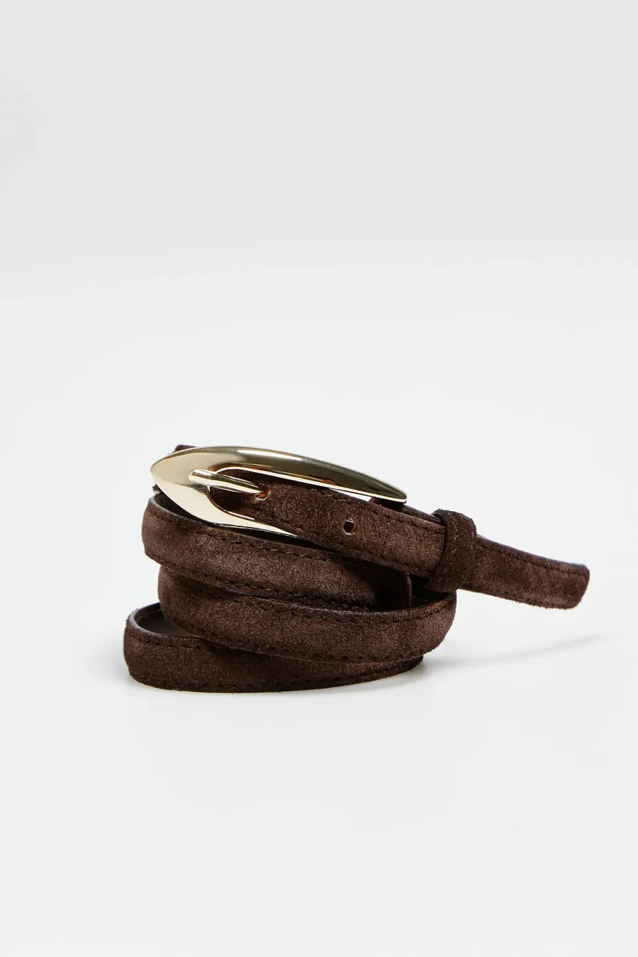 Brązowy, cienki pasek z naturalnej skóry zamszowej, z owalną klamrą w kolorze złota. Ręcznie wykonany w polskiej manufakturze.