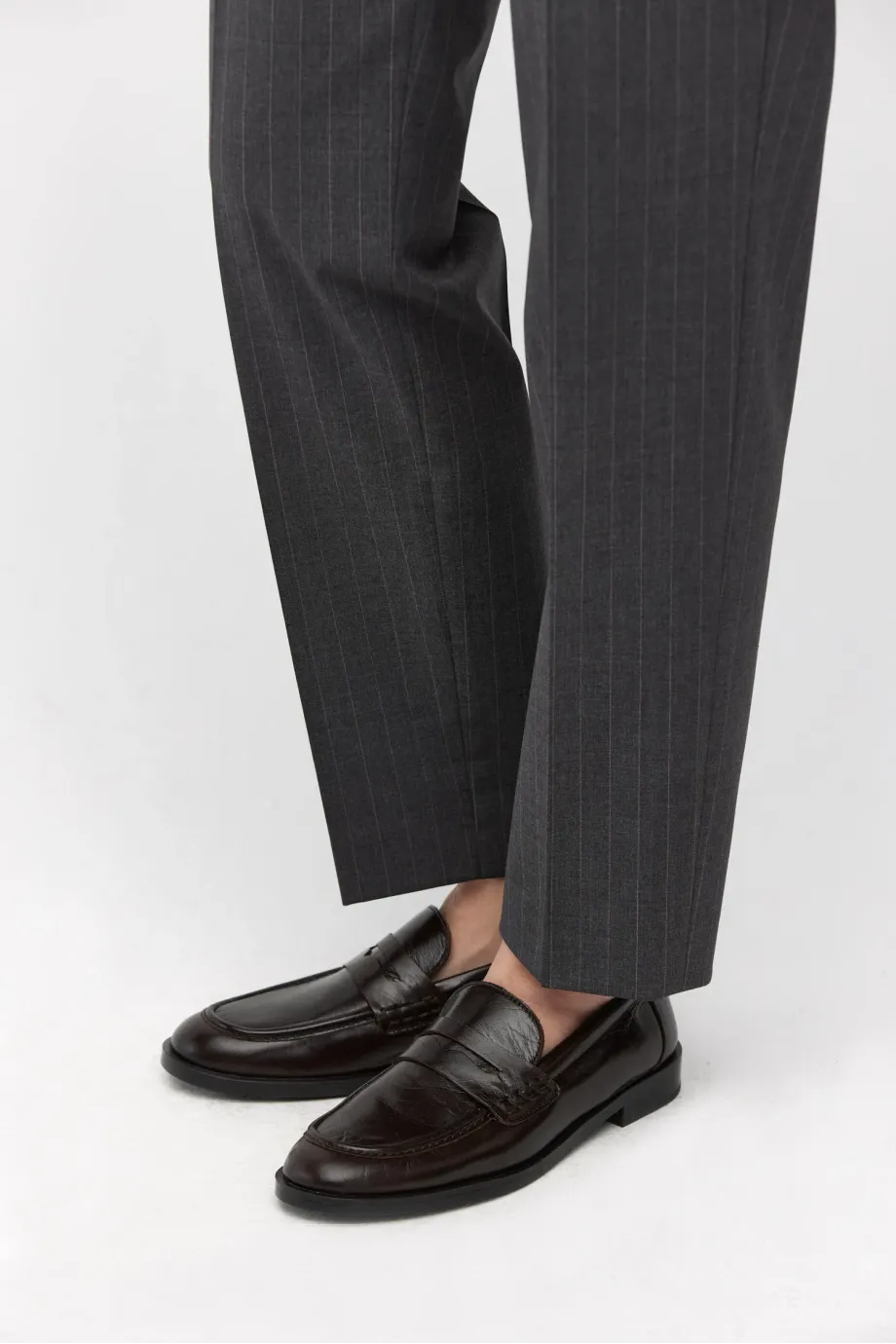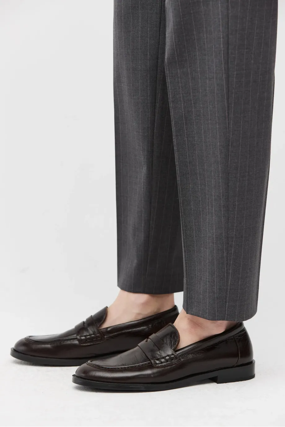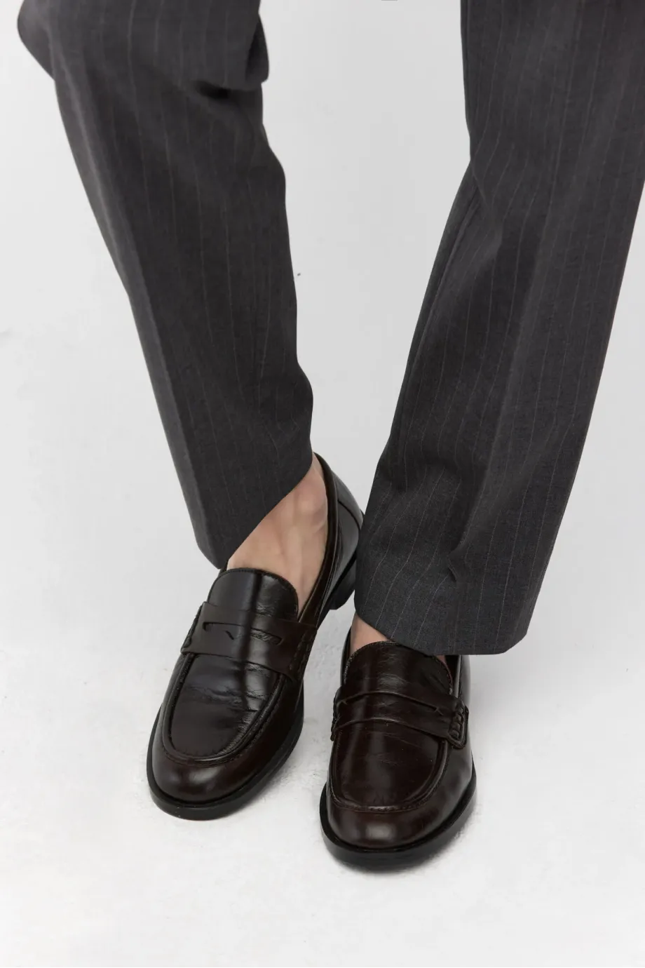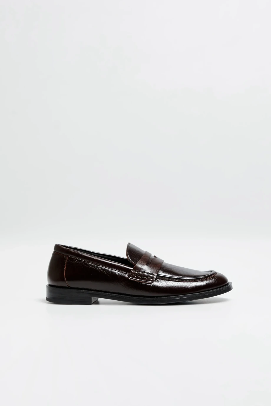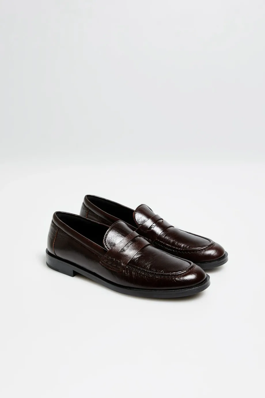 Loafersy o minimalistycznym fasonie z charakterystycznym paskiem typu penny. Wykonane z wysokiej jakości, naturalnej skóry licowej w głębokim odcieniu oberżyny. Ręcznie wyprodukowane w hiszpańskiej manufakturze.