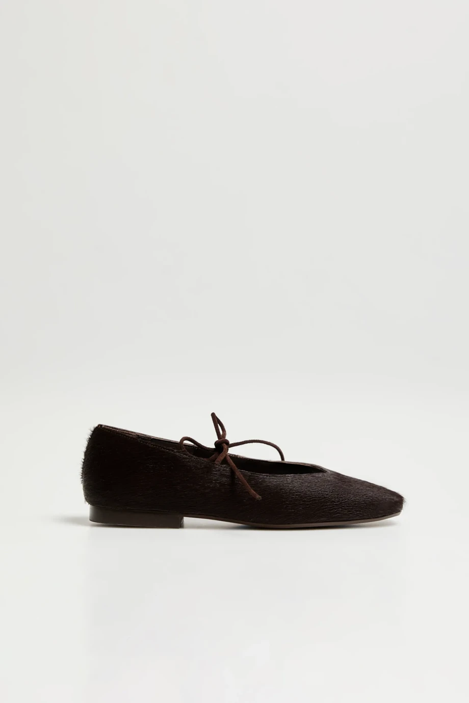 Baleriny wykonane z naturalnej skóry z dłuższym włosem, w głębokim odcieniu ciemnego brązu. Niska cholewka wiązana cienkim rzemieniem pozwala dopasować but do podbicia. Migdałowy nosek i płaska podeszwa zapewniają lekkość oraz elastyczność. Ręcznie uszyte w hiszpańskiej manufakturze.