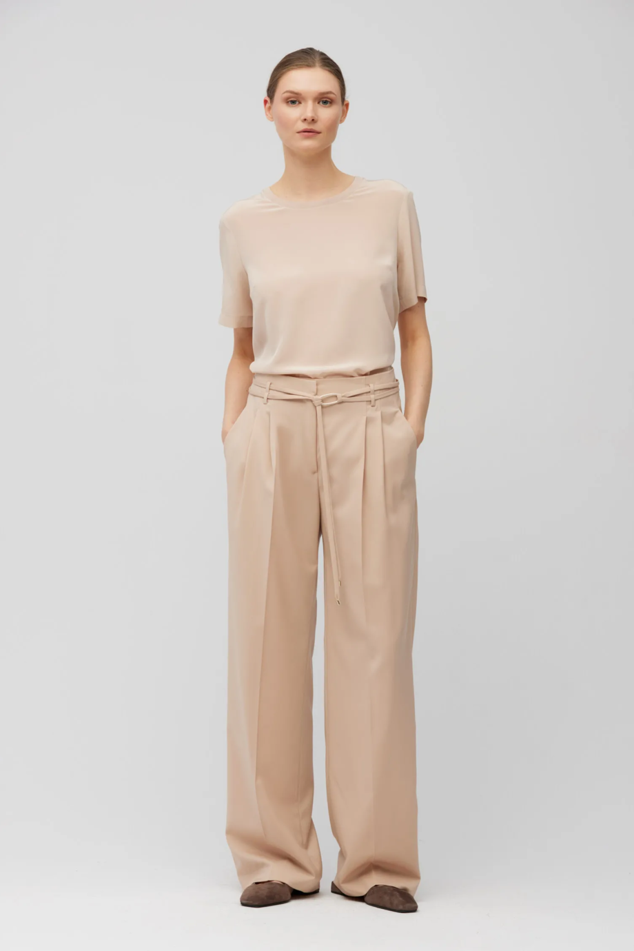 Model został zaprojektowany z wyższym stanem, który pięknie podkreśla talię i wydłuża sylwetkę. Zakładki z przodu zapewniają komfortowy luz w biodrach, a prosta, szersza nogawka z wyraźnym kantem nadaje całości eleganckiej, architektonicznej formy. To szerokie spodnie w kant damskie, które doskonale odnajdują się zarówno w biurowych stylizacjach, jak i w bardziej formalnych zestawach. Kieszenie boczne, szlufki oraz pasek z tej samej tkaniny podkreślają spójność projektu, a starannie dopracowane detale, jak kryty suwak, haczyk i wewnętrzny guzik z naturalnego orzecha corozo - świadczą o jego luksusowym charakterze. Polecamy nosić je w komplecie z żakietem z tej samej tkaniny lub zestawiać z jedwabną bluzką czy dzianinowym topem z kaszmirem z naszej kolekcji.