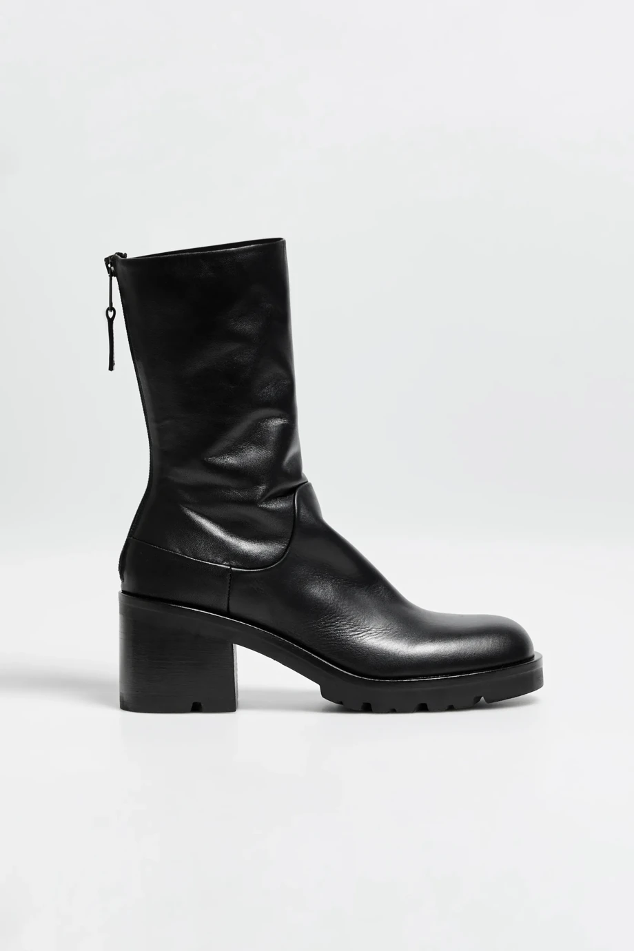 Czarne botki, z wysoką cholewką ze skóry licowej. Z tyłu zapięcie. Stabilna, masywna podeszwa. Ręcznie uszyte we włoskiej manufakturze.