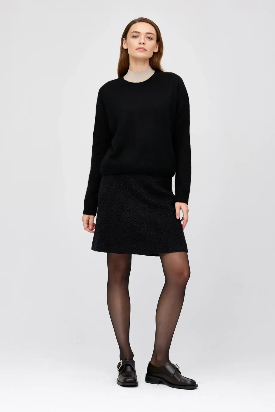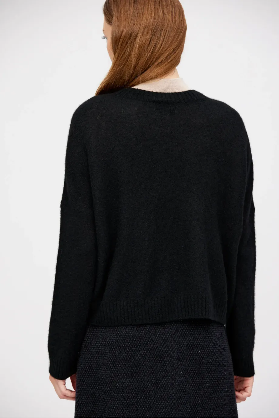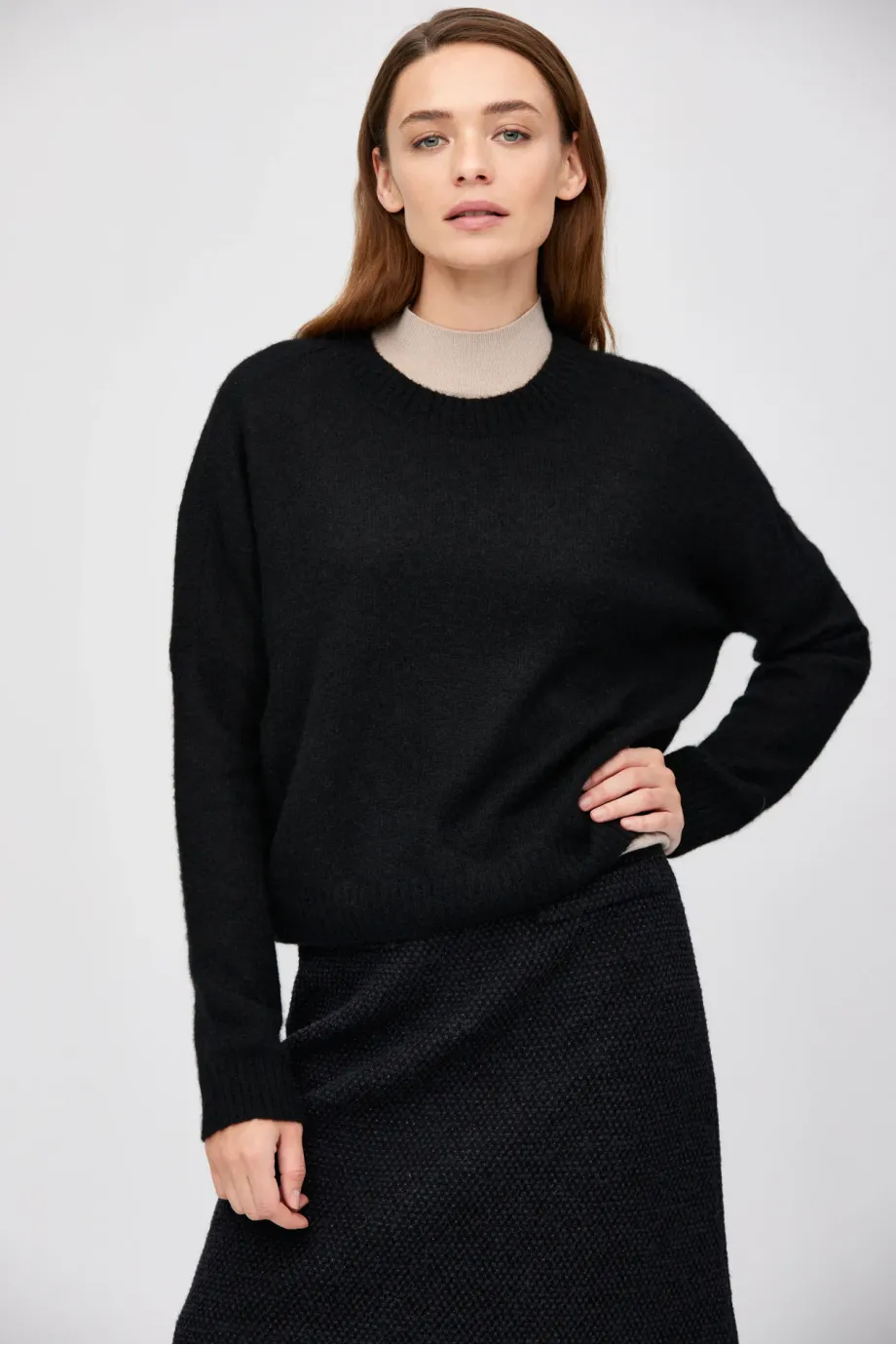 Prosty fason z okrągłym dekoltem i długim rękawem. Miękka i delikatna dzianina z kaszmirem i jedwabiem. Splot jersey knit wykonany na maszynie o uigleniu 7 GG.