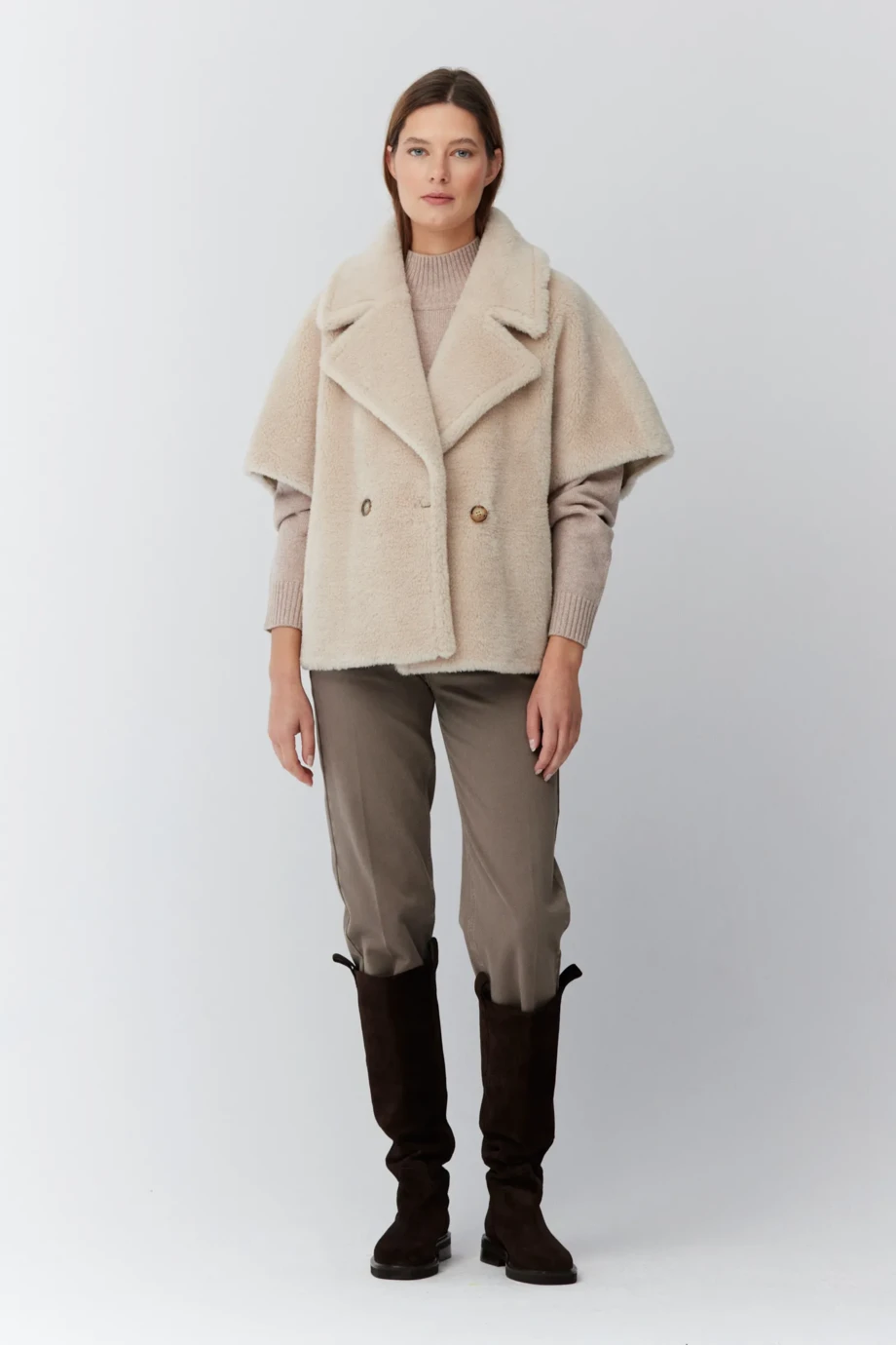 Kurtka z wełny typu teddy bear, o prostej formie i długości do łokcia. Dwurzędowa, zapinana na naturalne guziki, z kieszeniami i dużym kołnierzem.