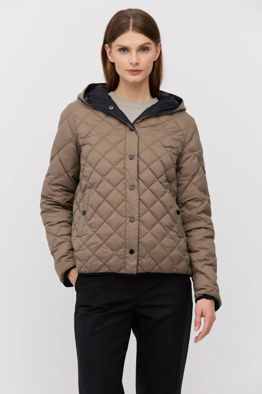Dwustronna kurtka z kapturem w odcieniach jasnego brązu i czerni, wypełniona naturalnym puchem. Lekka, zapinana na napy, z kieszeniami. Może być noszona samodzielnie lub jako dodatkowe docieplenie pod płaszcz.
