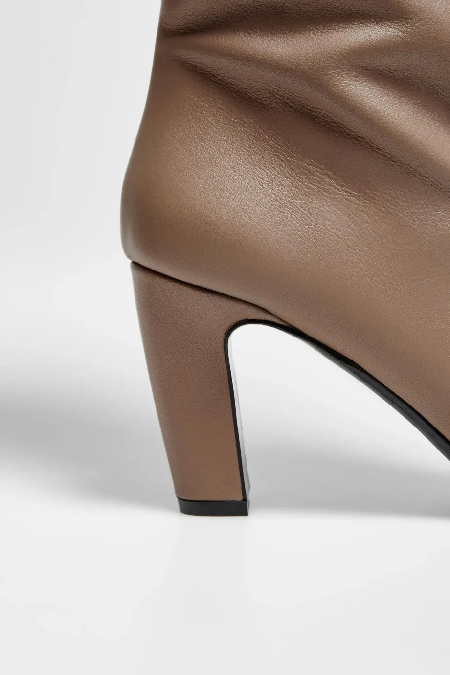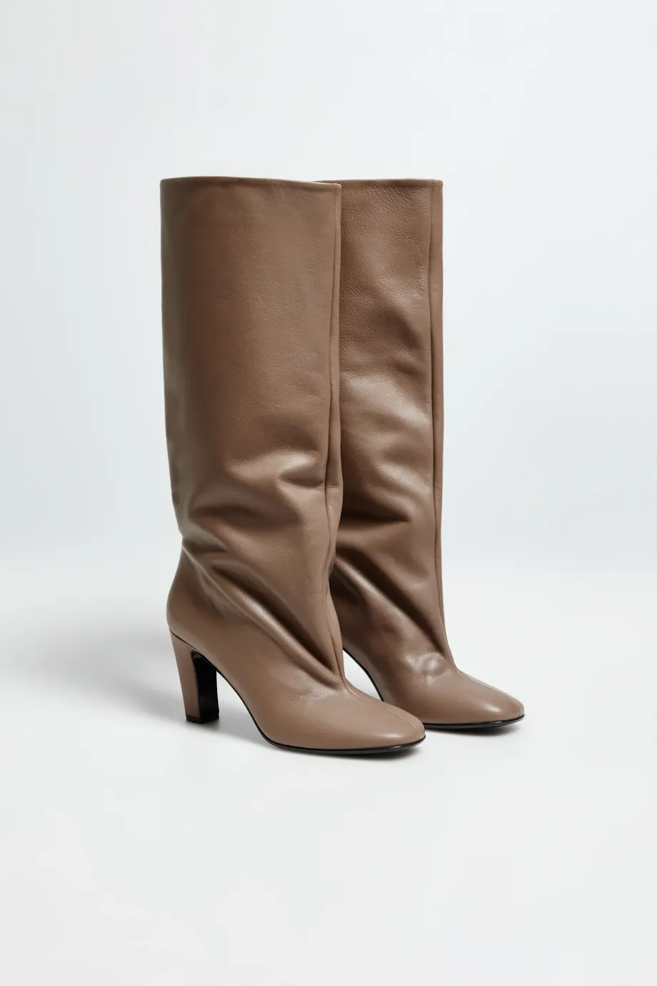 Wsuwane kozaki z naturalnej skóry licowej w kolorze brązowym. Okrągły nosek, wysoki obcas i szeroka cholewka. Minimalistyczne. Ręcznie wykonane we włoskiej manufakturze.