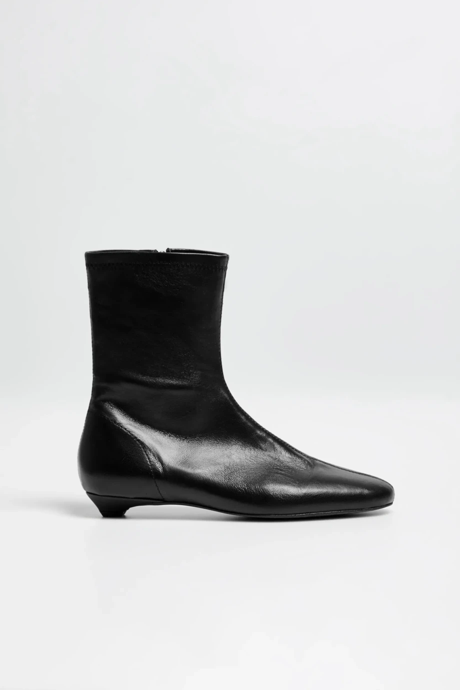 Czarne botki z bardzo miękkiej, naturalnej skóry, wykonane ręcznie w polskiej manufakturze. Klasyczny model z prostą cholewką i okrągłym noskiem, zapinany na zamek, na niskim obcasie typu kitten heel. Minimalistyczna forma.