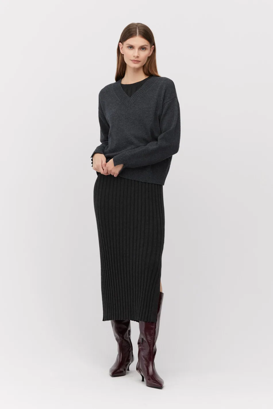 Ciemnoszara, dopasowana sukienka dzianinowa z domieszką wełny merynosowej, pionowy prążek -splot rib 12 gg. Długi rękaw, okrągły dekolt i rozcięcie z boku. Długość midi.