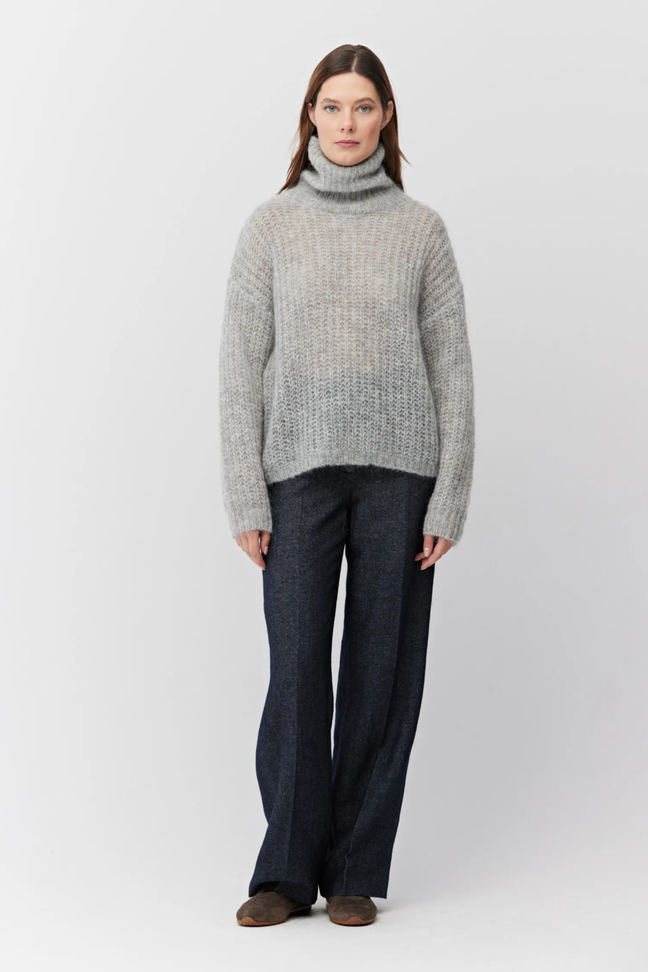 Szary sweter z dłuższym włosem, z mieszanki wełny i delikatnego 'kid' moheru. Golf, długi rękaw, luźna forma. Dzianina o luźnym splocie half cardigan wykonana na maszynie o uigleniu 3 GG.