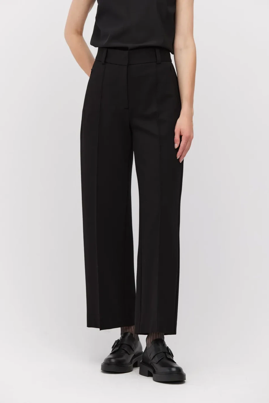 Czarne spodnie z wyższym stanem. Szerokie nogawki z kantem. Zapinane kieszenie boczne, ozdobne wykończenia wewnętrzne. Szlufki. Zapięcie na kryty suwak, haczyk oraz wewnętrzny guzik z naturalnego orzecha corozo.