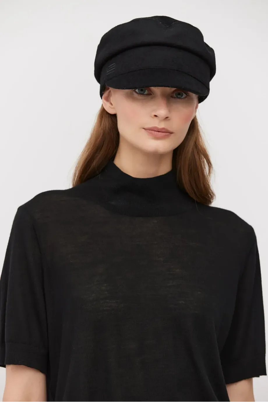 Czarny półgolf z krótkim rękawem Patrizia Aryton redefiniuje prostotę w nowoczesnym wydaniu. Wykonany z wełny merynosowej o drobnym ściegu jersey knit, gwarantuje przyjemność noszenia i precyzyjne dopasowanie do potrzeb współczesnej kobiety. Krótki rękaw z subtelnym wydłużeniem z tyłu i opływowymi krawędziami, prowadzącymi do centralnego rozcięcia, wprowadza dynamikę i delikatny ruch. Wykończenia ściągaczowe na rękawach i dole podkreślają linię sylwetki, nie krępując przy tym gestów.