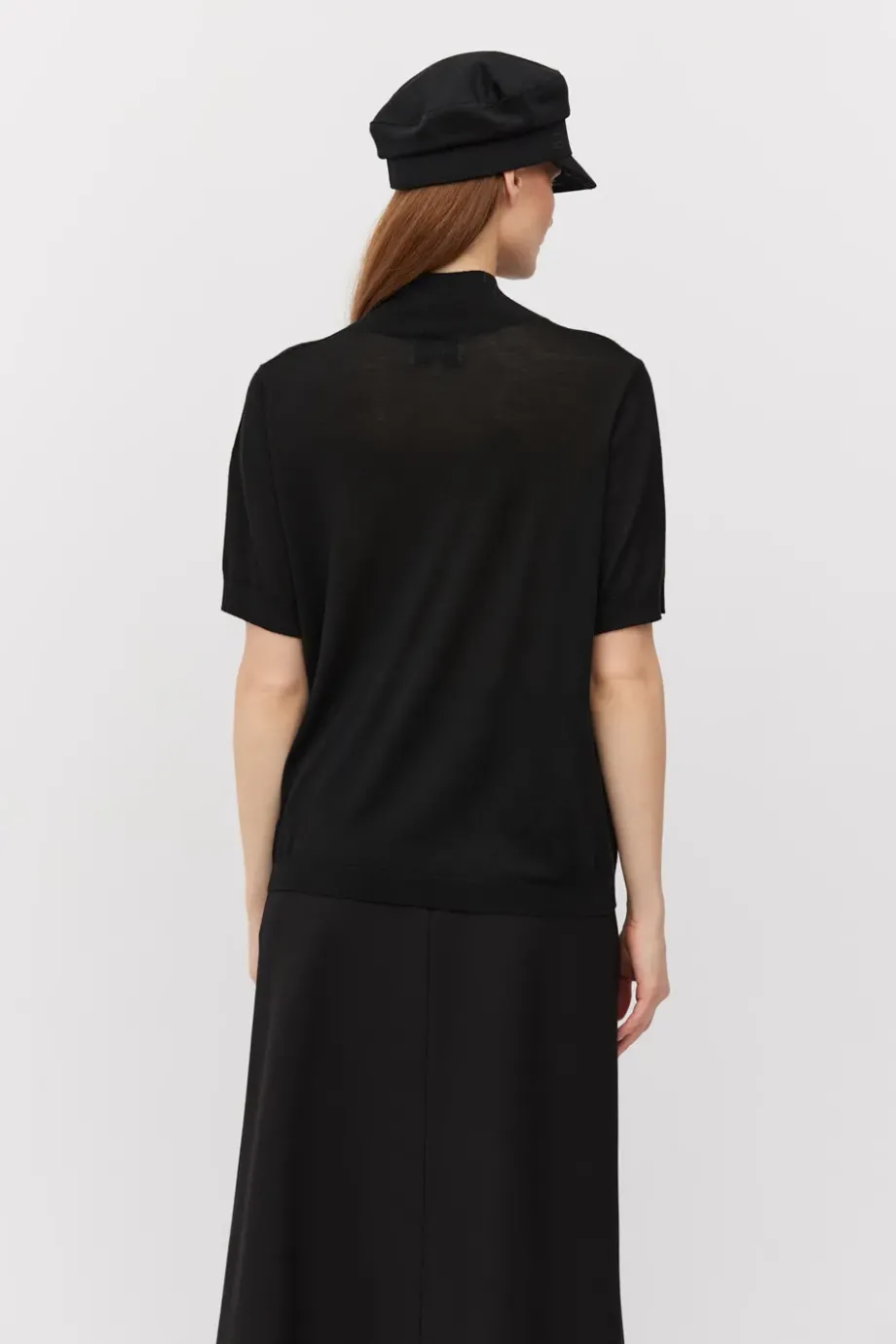 Półgolf z wełny merynosowej. Prosta forma z krótkim rękawem. Dzianina o drobnym ściegu jersey knit, wykonana na maszynie o uigleniu 18 GG. Kolor czarny.
