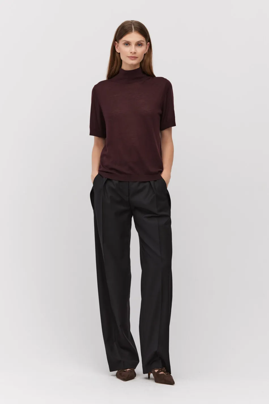 Wiśniowy półgolf łączy w sobie minimalistyczną formę i ponadczasowy szyk, tworząc bazę dla wielu stylizacji. Nasz półgolf z krótkim rękawem, doskonale odnajduje się zarówno w biznesowych zestawach, jak i w bardziej swobodnych, weekendowych lookach. Kolor głębokiej wiśni to wyrafinowana alternatywa dla klasycznych neutralnych barw - nadaje stylizacji elegancji, ale też świeżego charakteru.