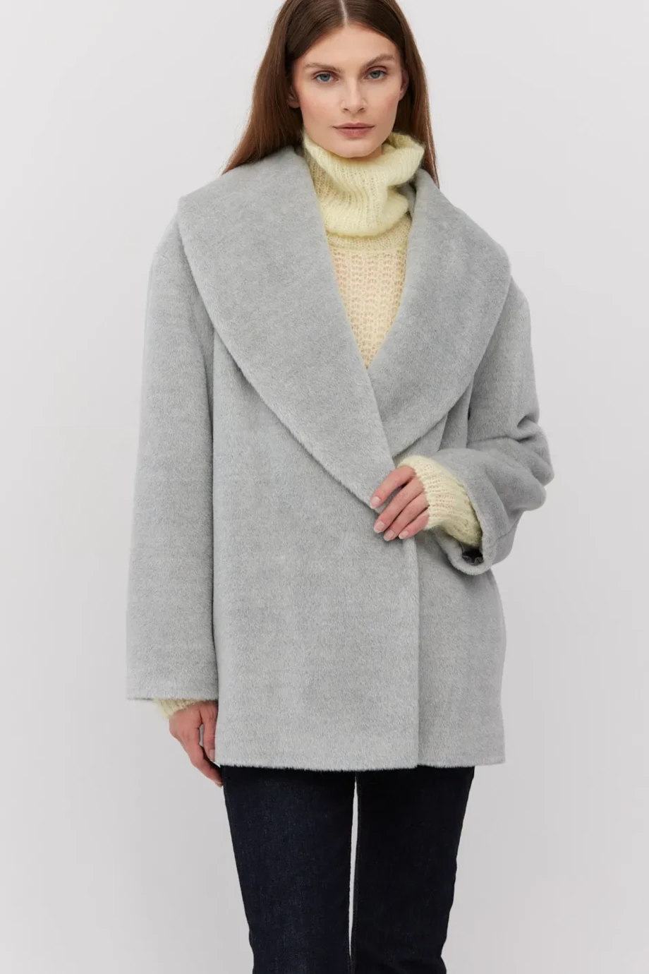 Platynowa szarość tego modelu przywodzi na myśl mglisty poranek w miejskim parku, kiedy światło nadaje całej przestrzeni spokój i elegancję. Obszerny kołnierz otula szyję i ramiona, a jego miękka linia prowadzi wzrok w dół sylwetki, podkreślając proporcje, nie przytłaczając figury. Baby suri alpaka w połączeniu z wełną dziewiczą tworzy lekki, puszysty materiał o melanżowej fakturze, który zachwyca w dotyku i w odbiorze wizualnym. Oto kurtka z szalowym kołnierzem, której sekrety koniecznie powinnaś odkryć!