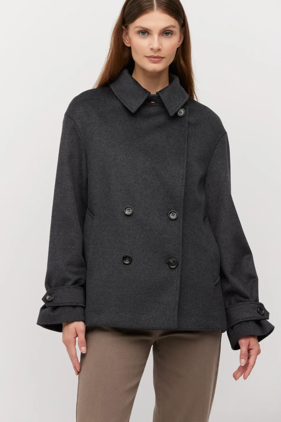Ciemnoszara kurtka z wełny o luźnym fasonie. Dwurzędowa, zapinana pod szyją. Model z podszewką, lekko opadającymi ramionami, kontrafałdą z tyłu i pagonami na rękawach.