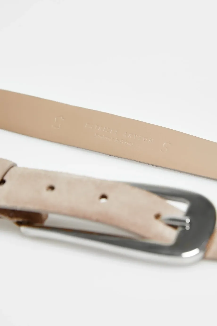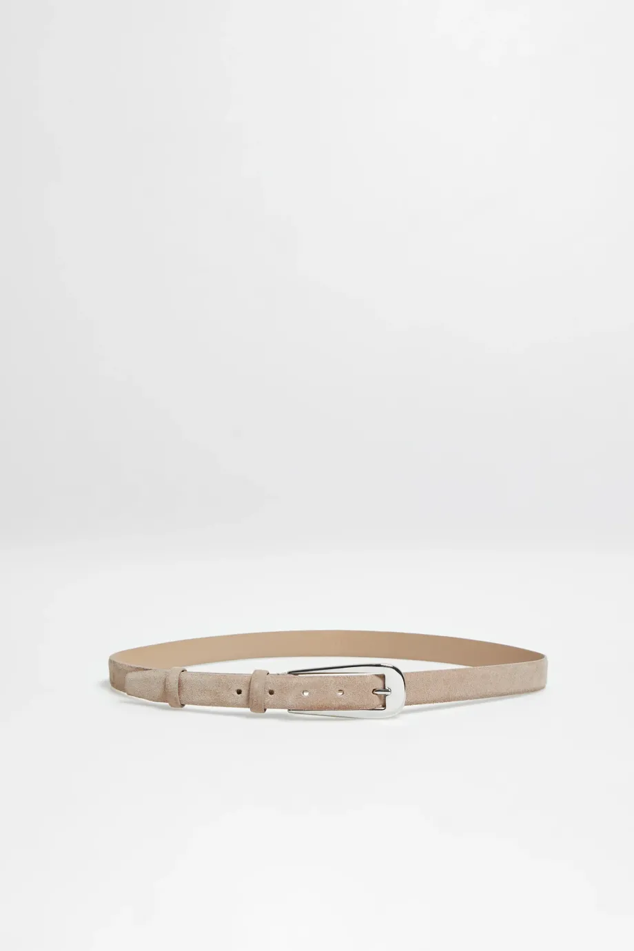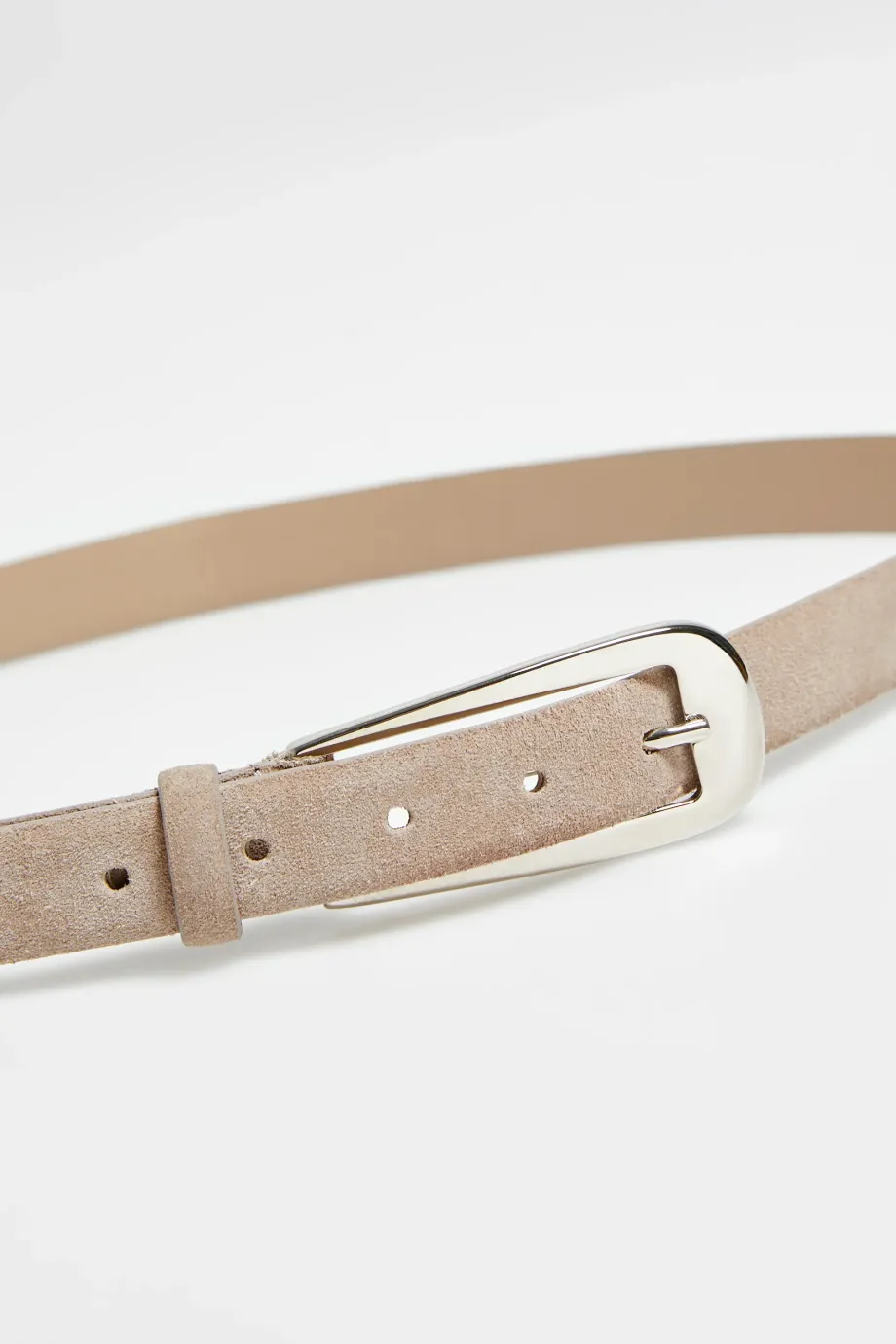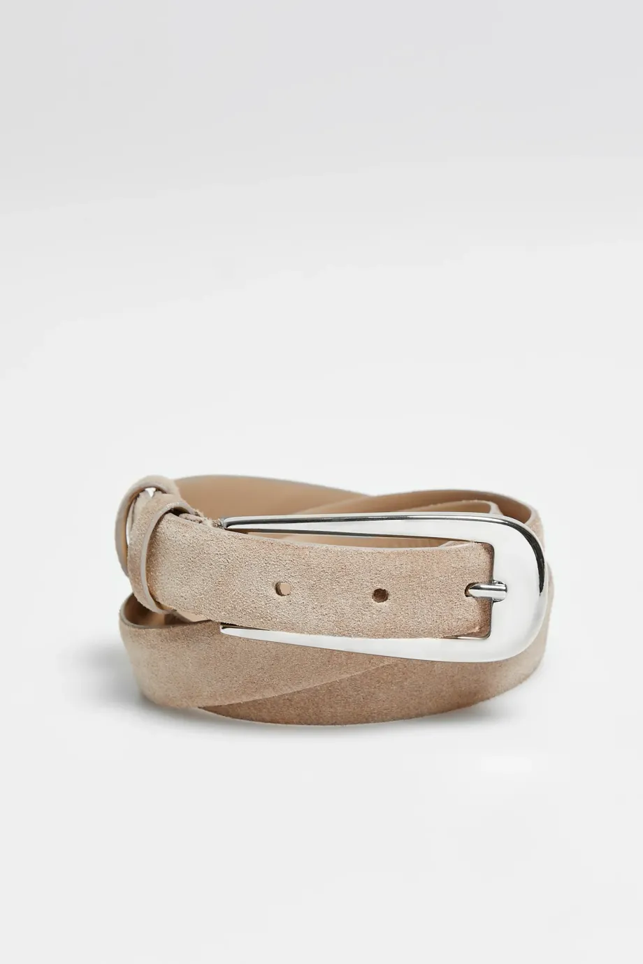 Beżowy, pasek z naturalnej skóry zamszowej, z klamrą w kolorze srebra. Wykonany ręcznie w polskiej manufakturze.