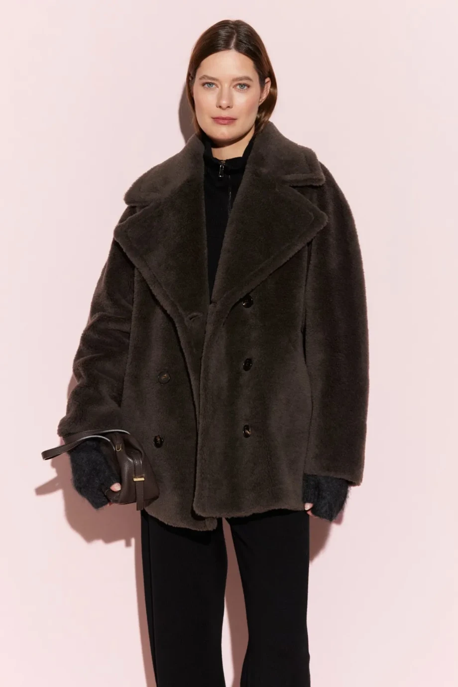 Kurtka z wełny teddy bear. Luźny, dwurzędowy fason. Kołnierz, kieszenie, długi rękaw. Zapięcie na guziki zewnętrzne z rogu naturalnego, wewnętrzne z orzecha corozo. Kolor ciemny brąz.