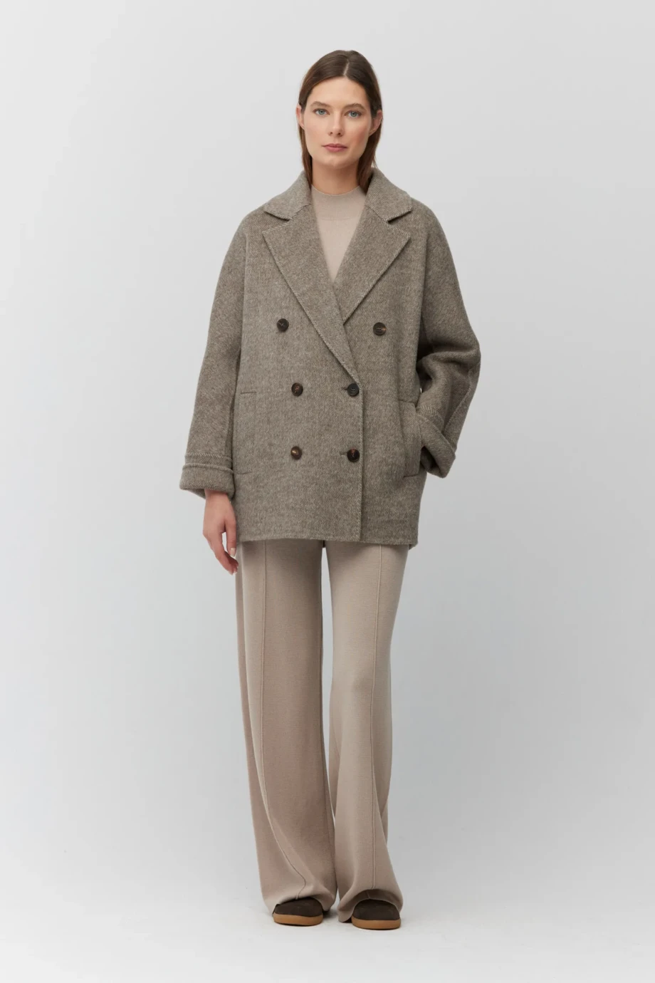 Kurtka doubleface z wełny z domieszką alpaki, o luźnej formie, niepodszewkowana, dwurzędowa, z kołnierzem i kieszeniami. Kolor brązowy, w jodełkę.