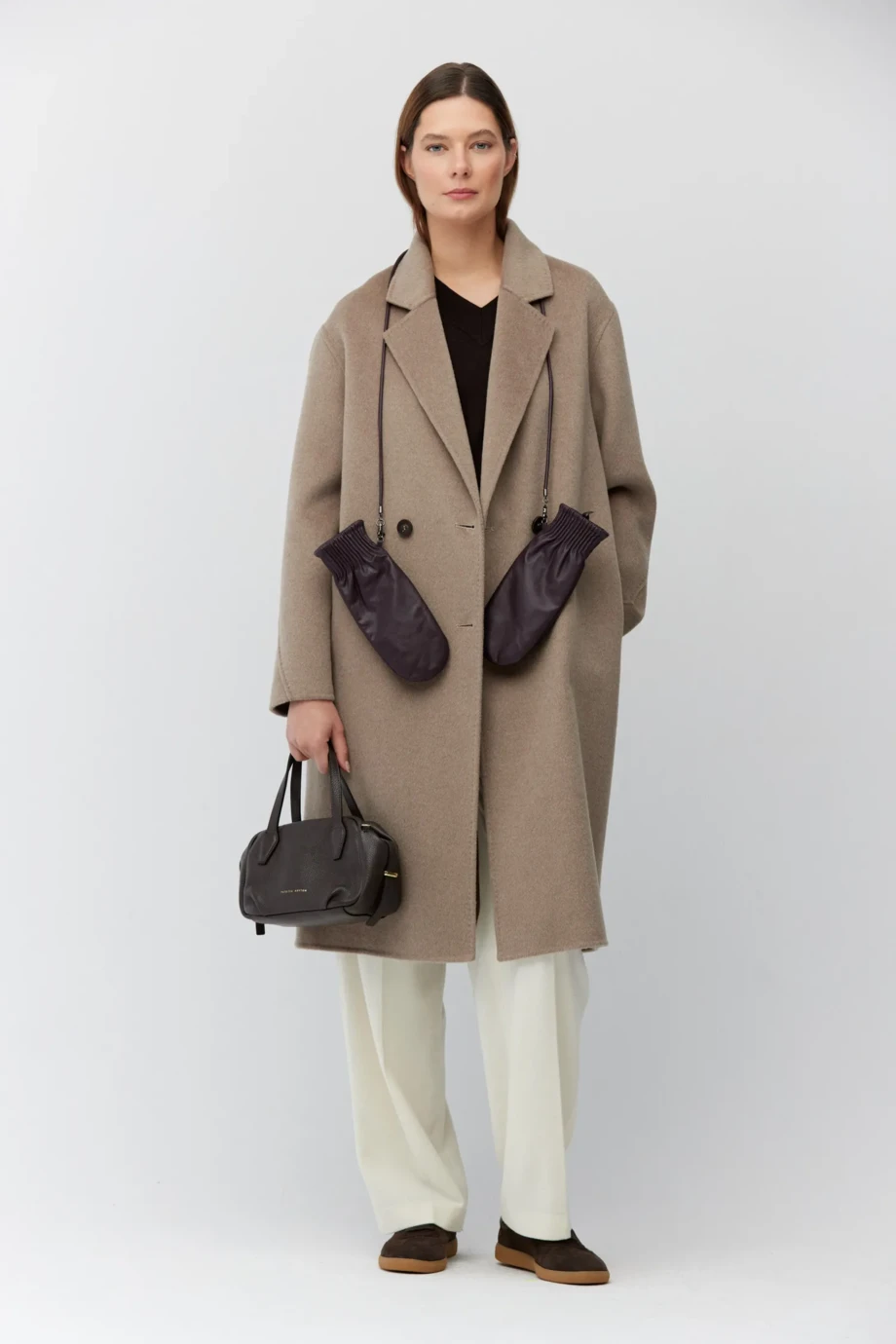 Płaszcz doubleface w kolorze jasnego brązu, z mieszanki wełny, jedwabiu i kaszmiru. Dwurzędowy, zapinany na guziki, z kołnierzem i kieszeniami. Prosta, luźna forma, niepodszewkowana.