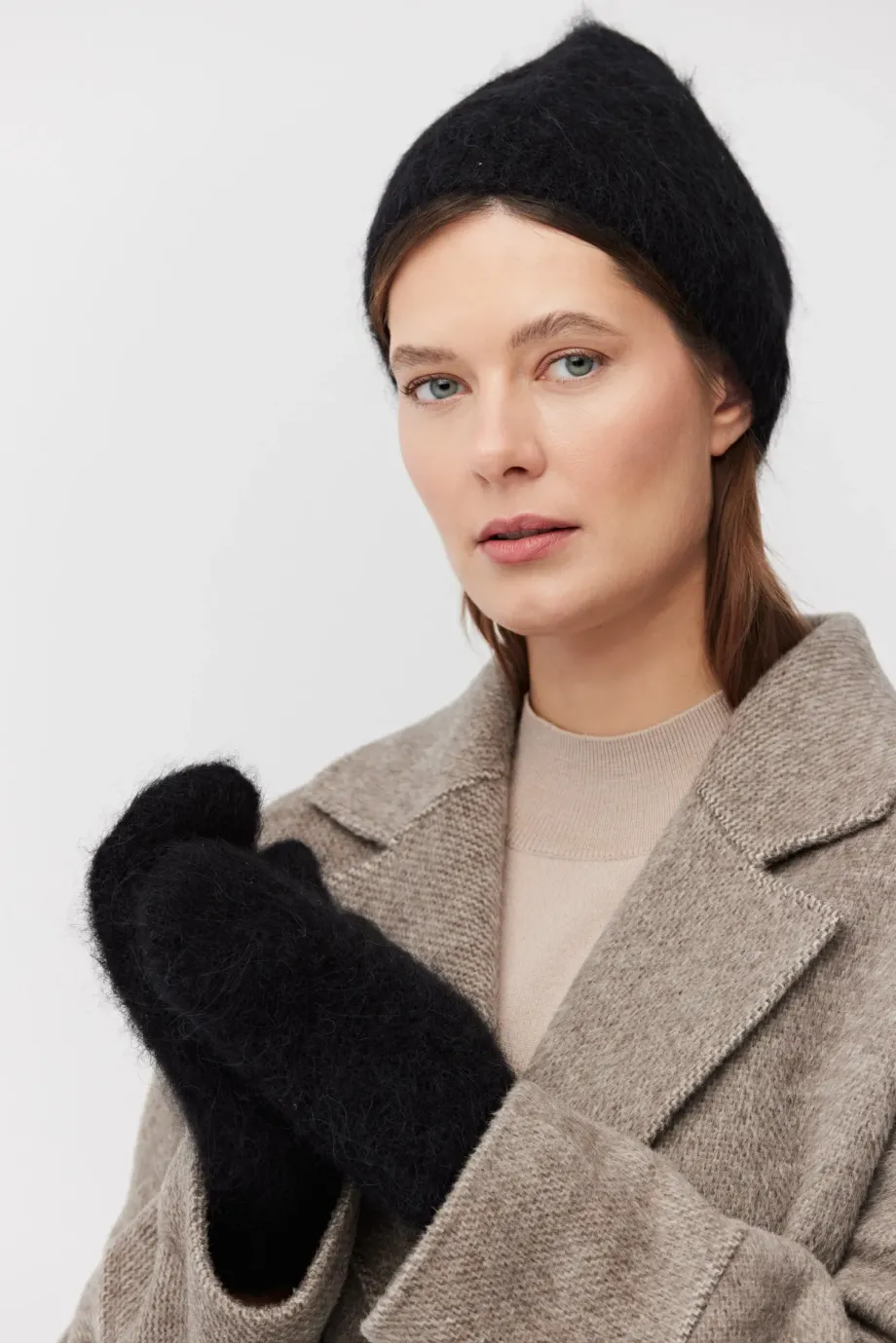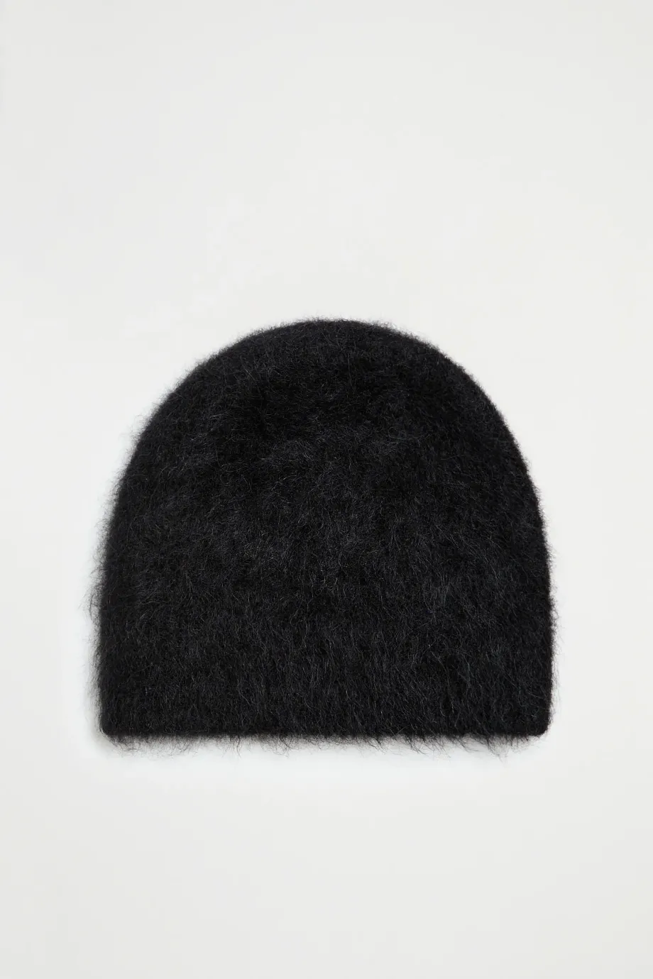 Czapka z wełną alpaki. Dzianina z dłuższym włosem o luźnym splocie single jersey, wykonana na maszynie o uigleniu 3 GG. Kolor czarny.