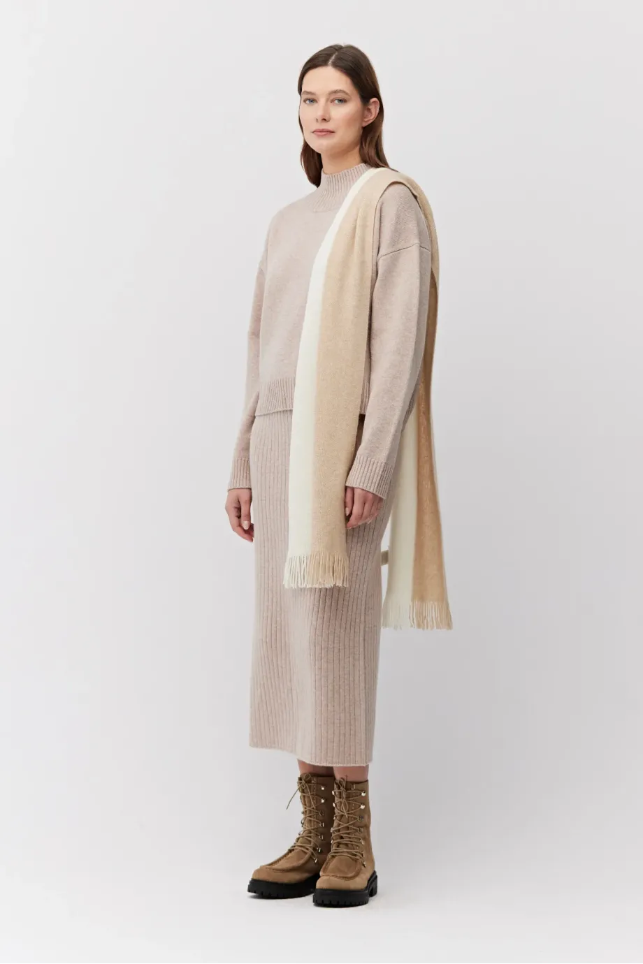 Szal z frędzlami. Kolor śmietanka-beż. 100% kaszmir.