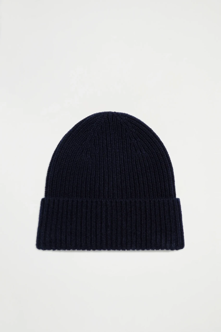 Czapka z domieszką kaszmiru. Miękka dzianina, ścieg angielski rib. Kolor granatowy.