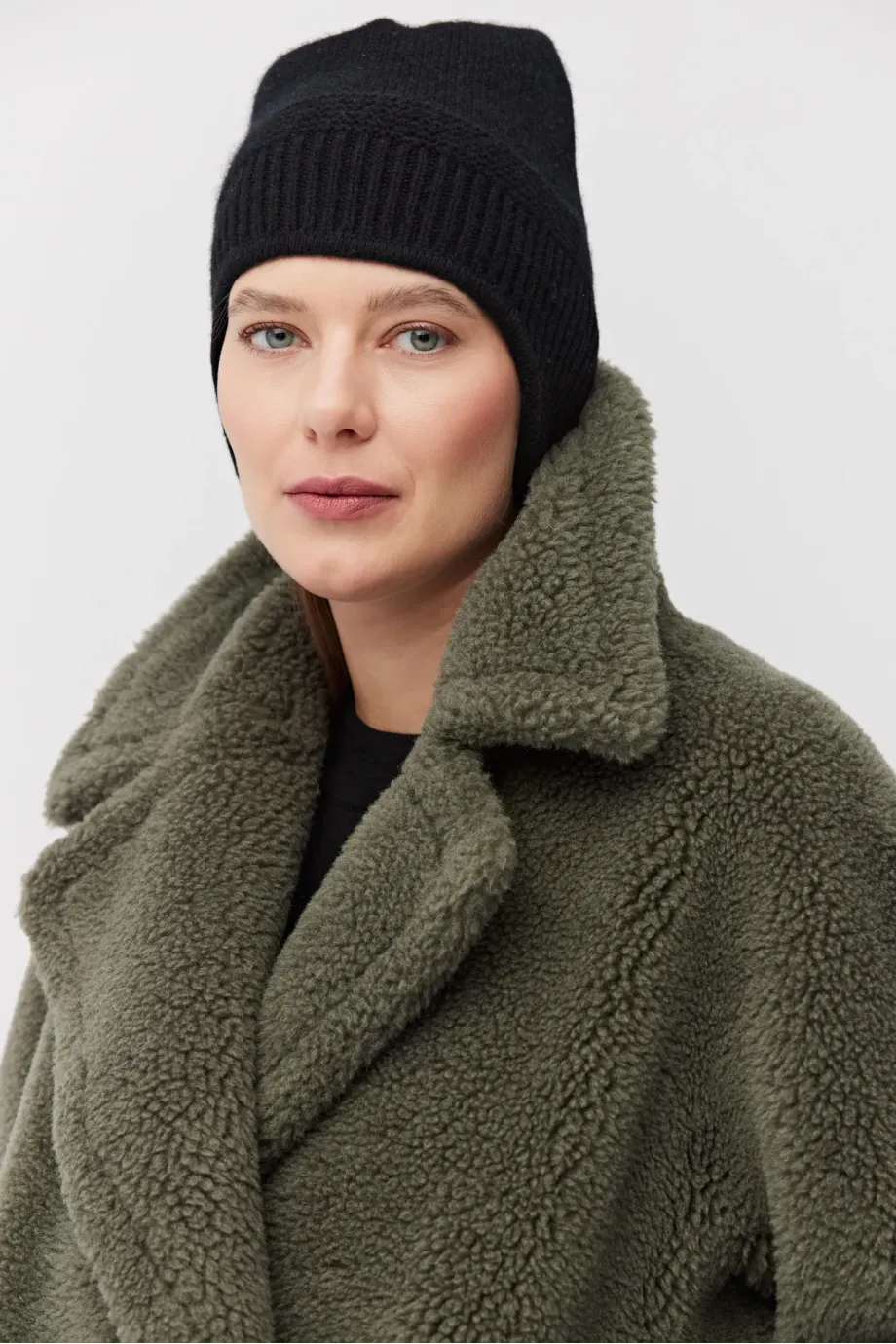 Czapka z wełny merynosowej i kaszmiru. Miękka dzianina, splot jersey knit, przygotowana na maszynie o uigleniu 3 GG. Kolor czarny.