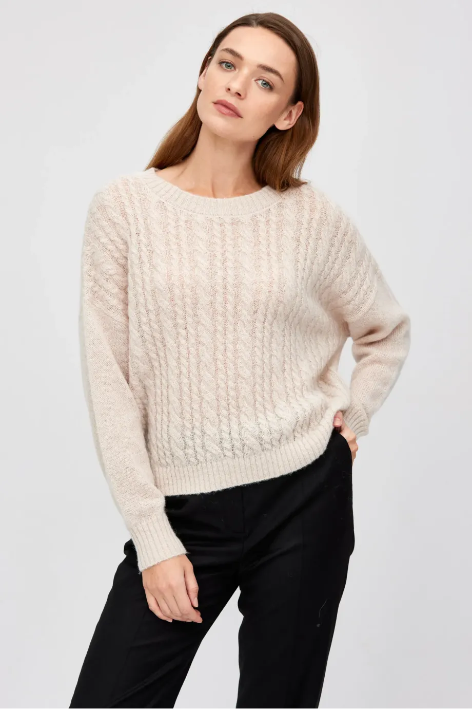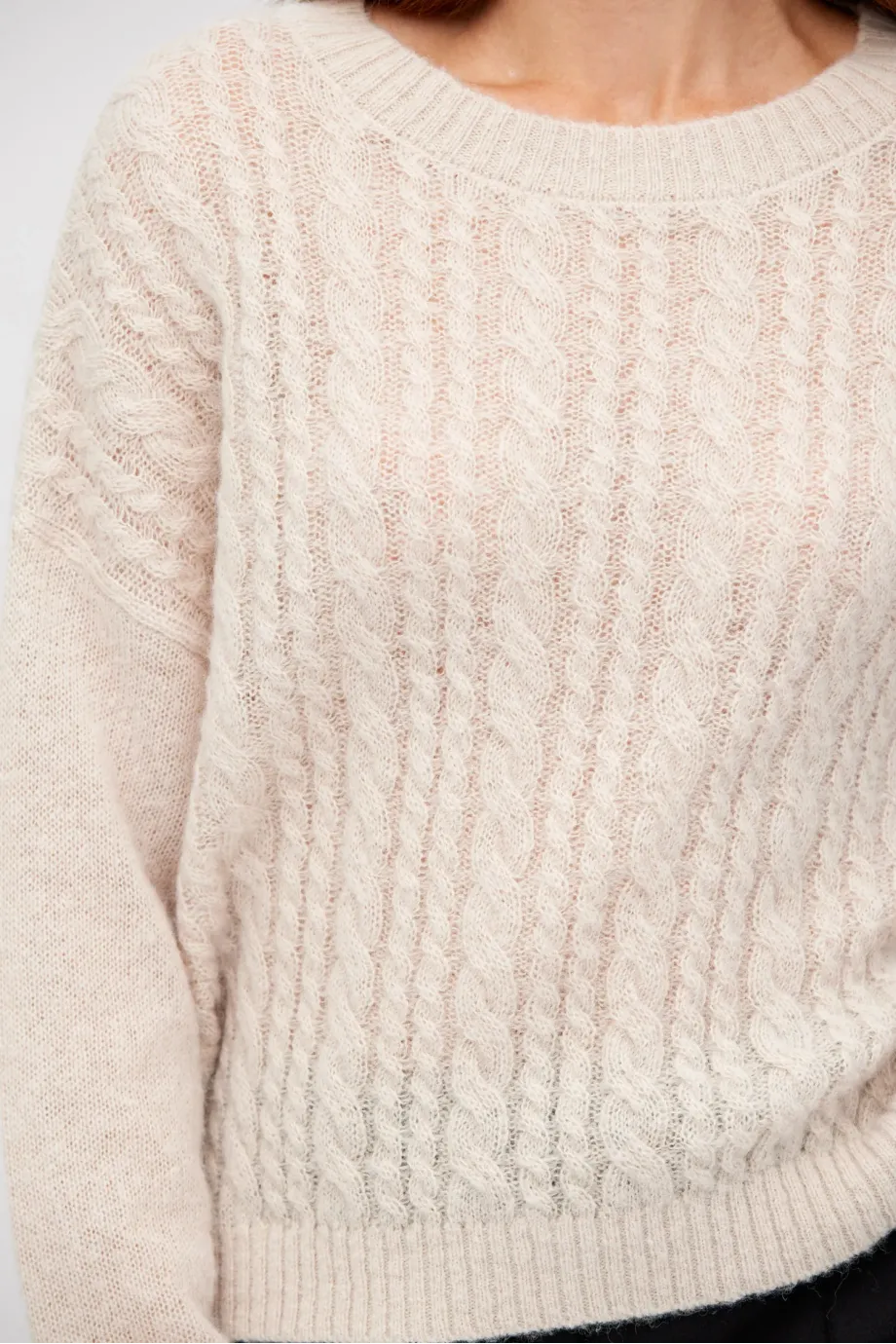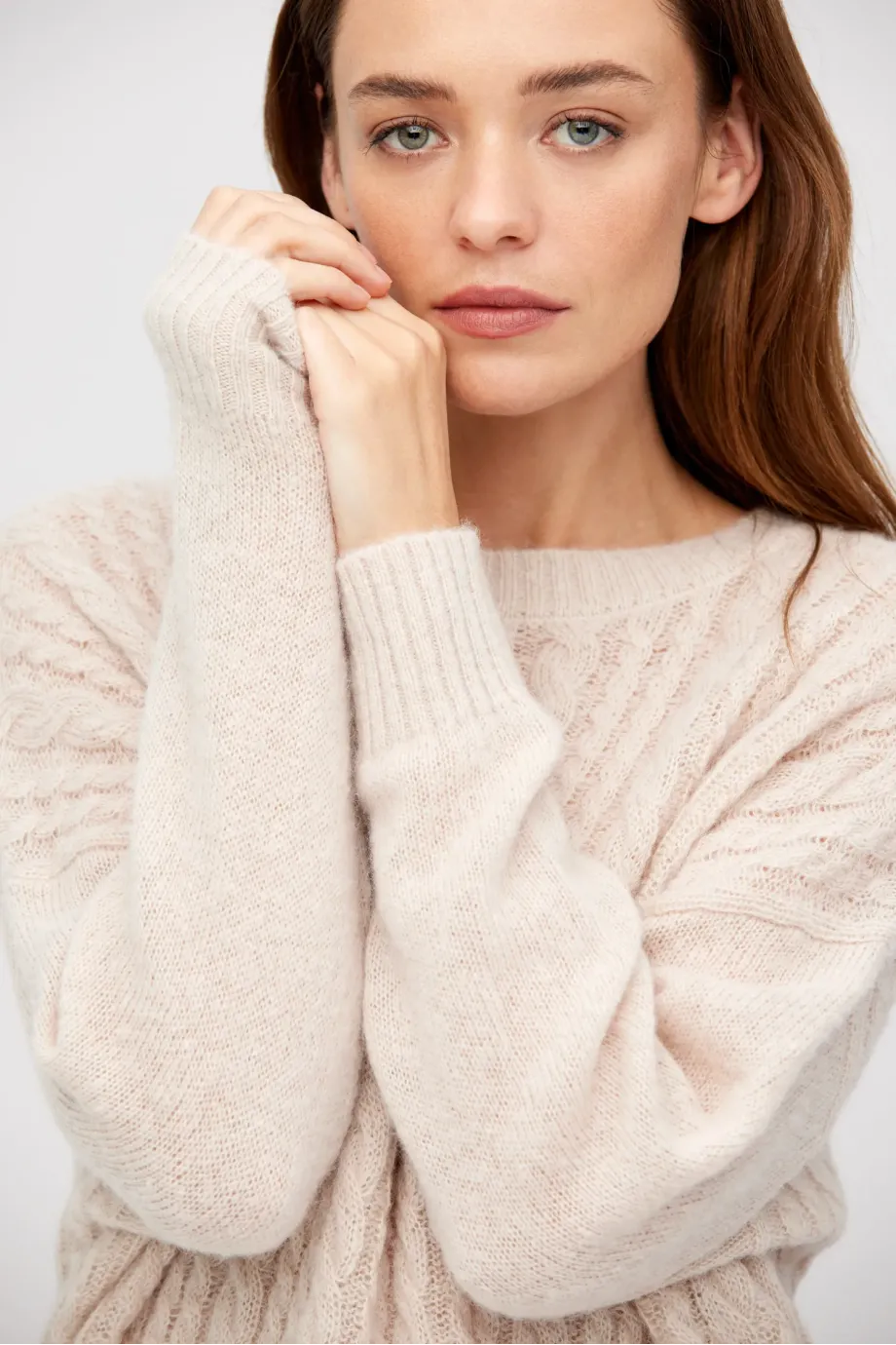 Sweter z wełny merynosowej i moheru. Długi rękaw, okrągły dekolt, luźny fason, krótka forma. Miękka dzianina o splocie cable knit, przygotowana na maszynie o uigleniu 7 GG. Kolor beż.