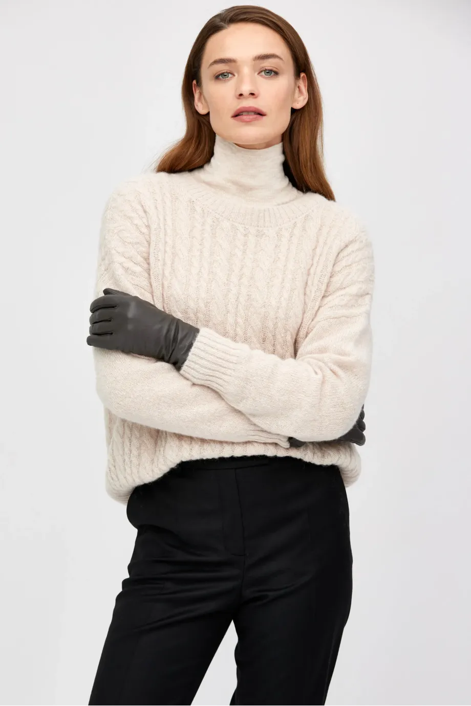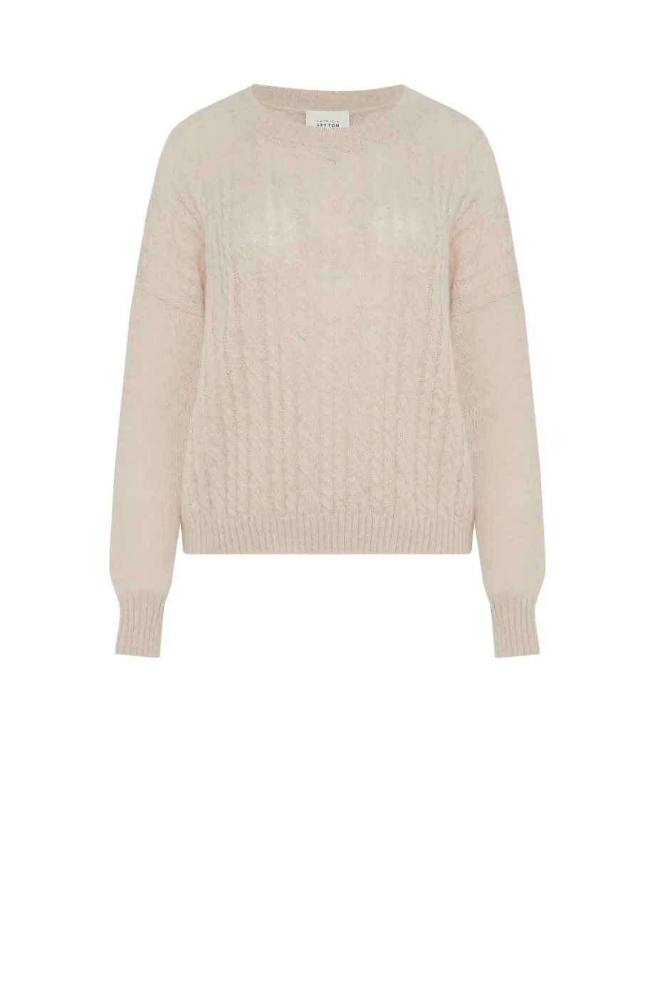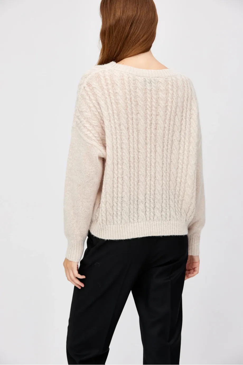 Sweter z wełny merynosowej i moheru. Długi rękaw, okrągły dekolt, luźny fason, krótka forma. Miękka dzianina o splocie cable knit, przygotowana na maszynie o uigleniu 7 GG. Kolor beż.