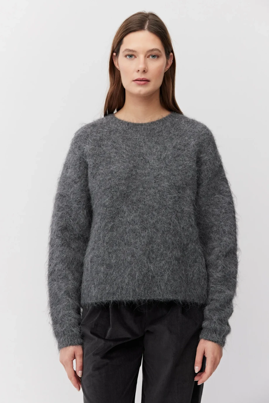 Szary sweter z wełną alpaki. Okrągły dekolt, długi rękaw. Miękka, ciepła dzianina z dłuższym włosem. Luźny splot single jersey, przygotowany na maszynie o uigleniu 3 GG.