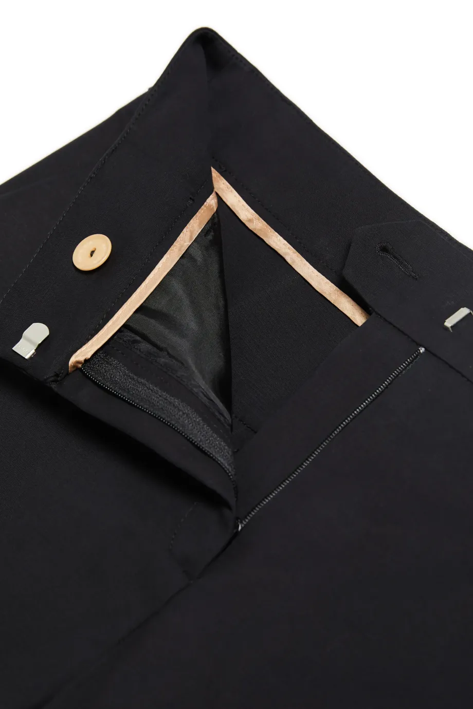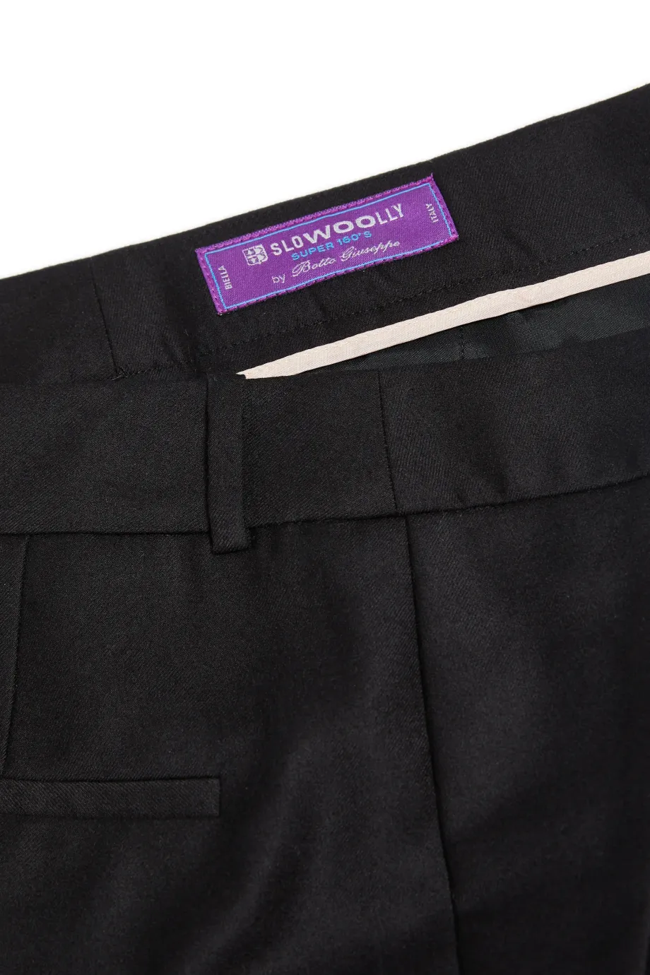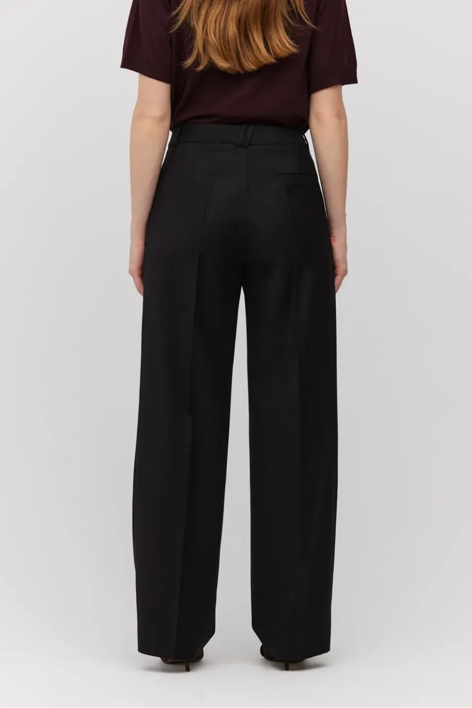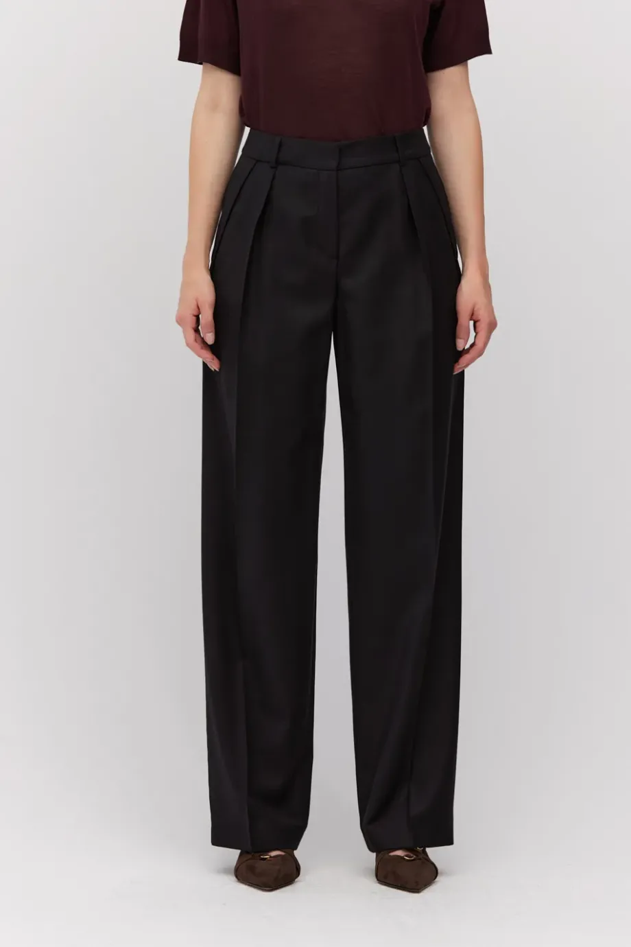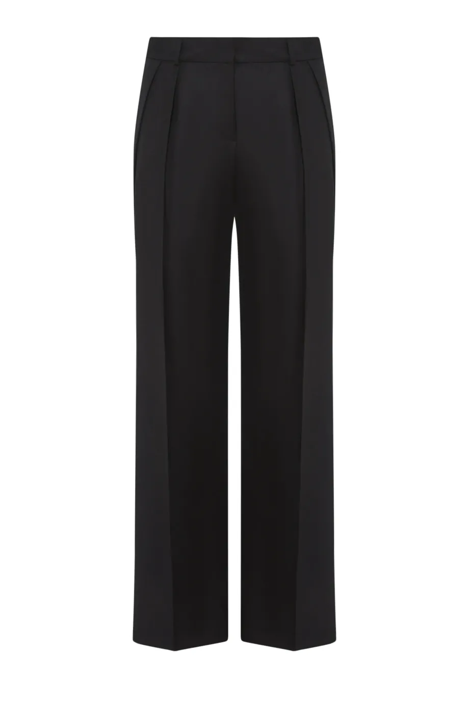 Wełniane spodnie z zakładkami. Szeroka nogawka, kieszenie, szlufki. Zapięcie na kryty zamek, haczyk, wewnętrzny guzik z orzecha corozo. Od środka ozdobny piping. Kolor czarny.