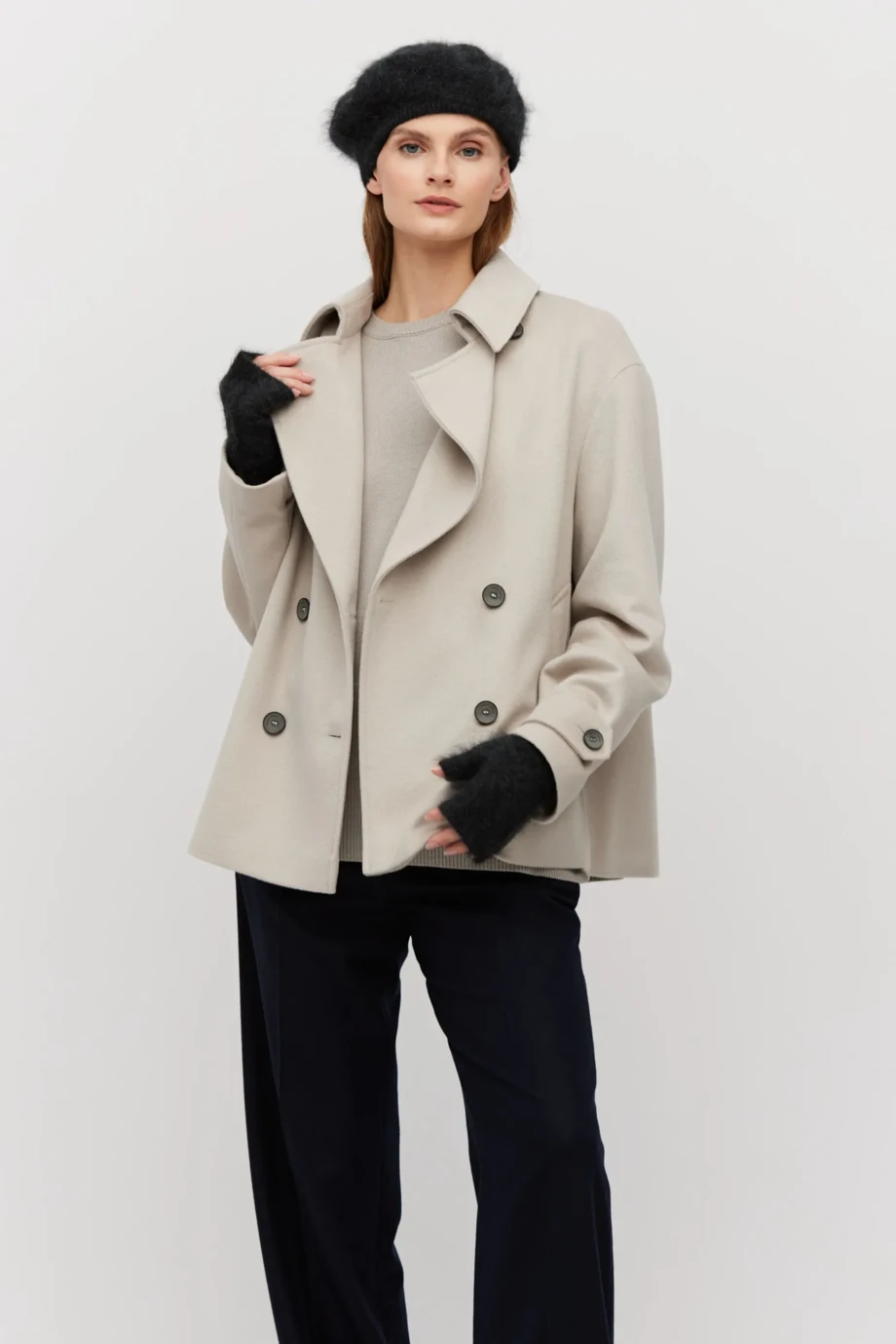 Beżowa kurtka z wełny o luźnym fasonie. Dwurzędowa, zapinana pod szyją. Model z podszewką, lekko opadającymi ramionami, kontrafałdą z tyłu i pagonami na rękawach.